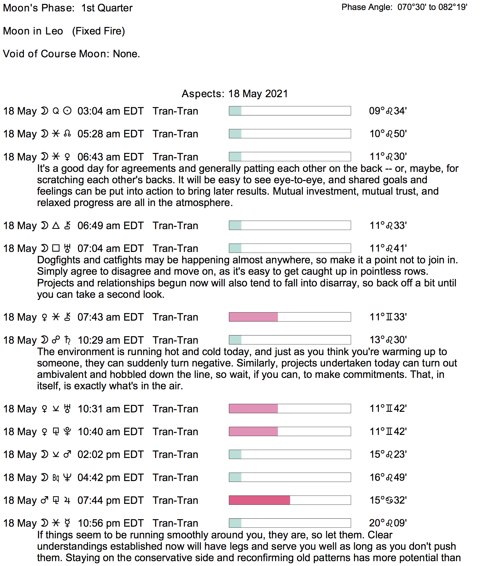 Planet Color Key: The longer the bar, the slower the aspecting planet, and the longer the duration of the planet’s transit.