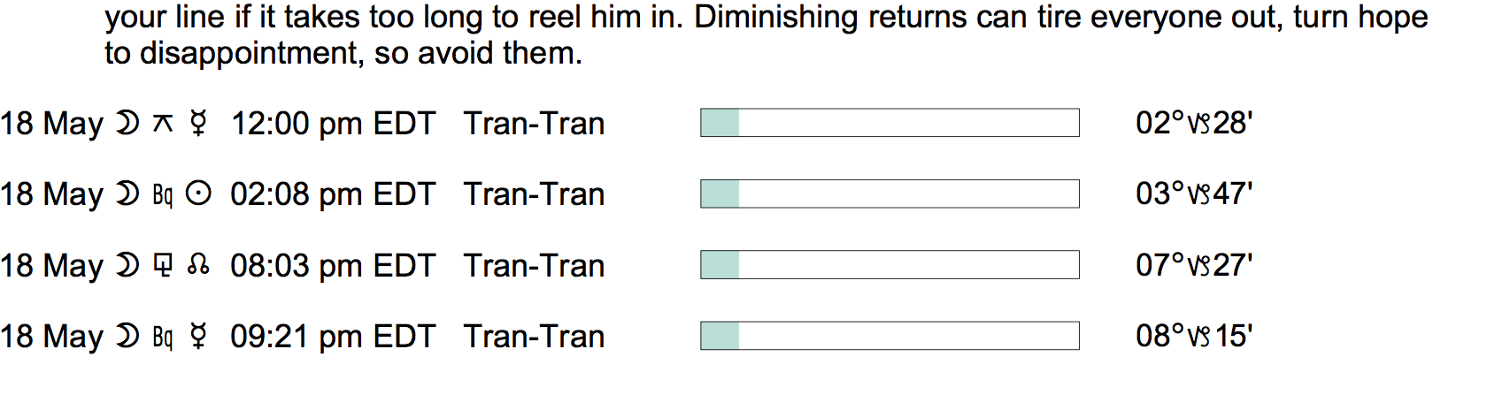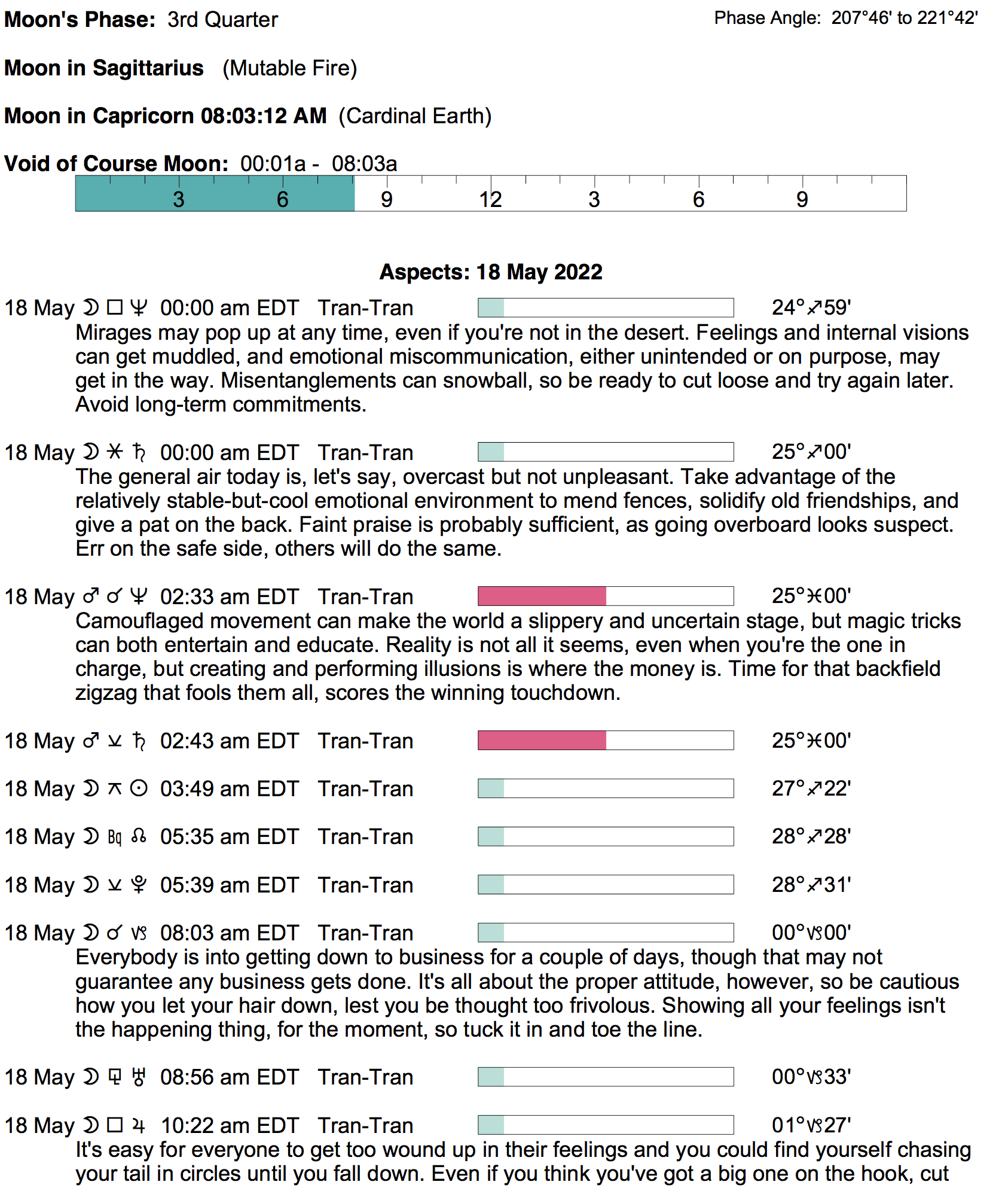 Planet Color Key: The longer the bar, the slower the aspecting planet, and the longer the duration of the planet’s transit.