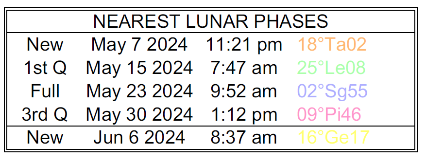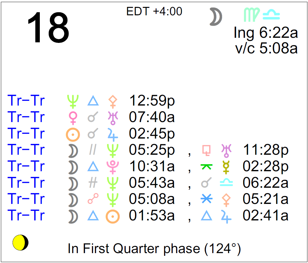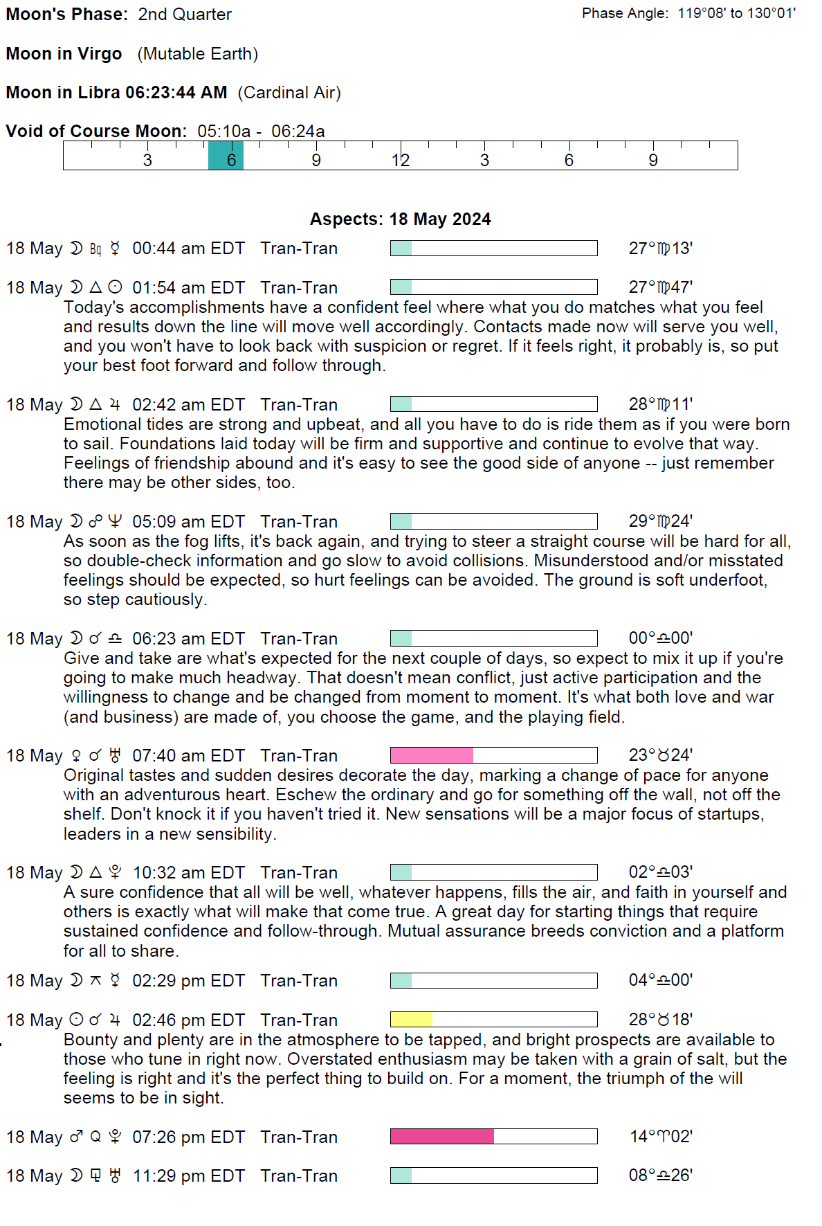 Planet Color Key: The longer the bar, the slower the aspecting planet, and the longer the duration of the planet’s transit.