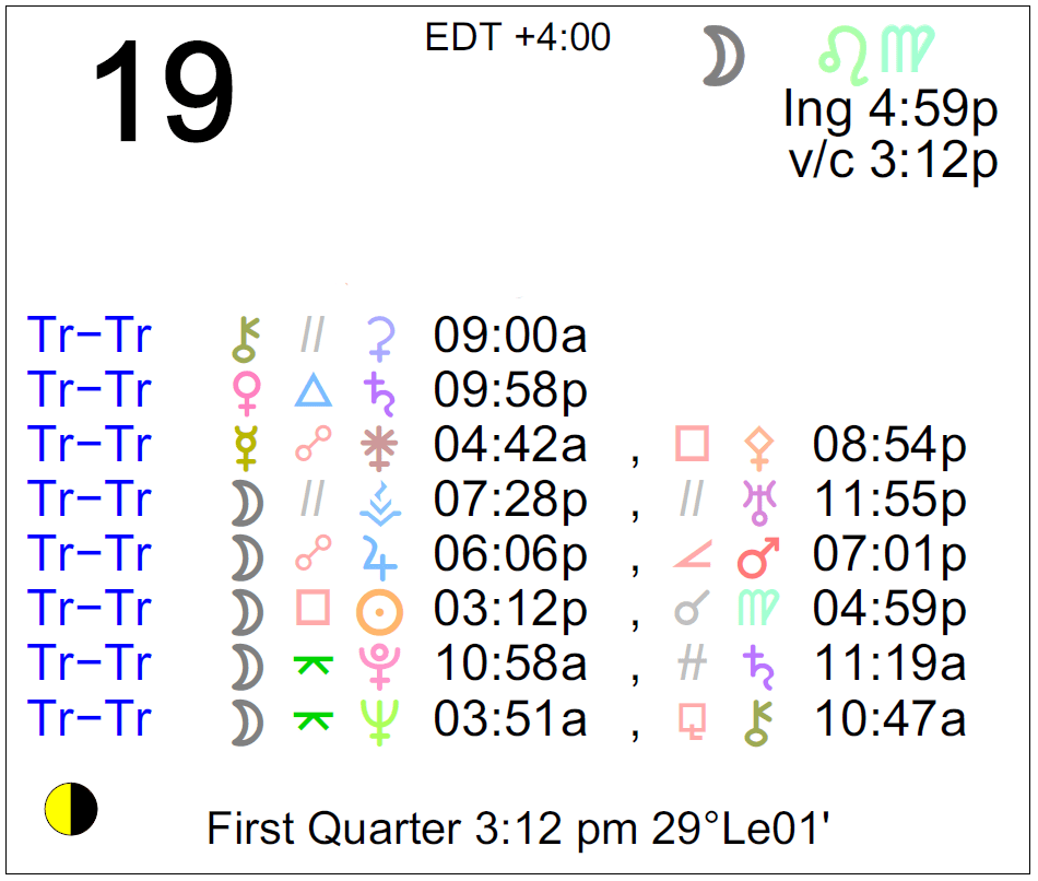 - The Moon continues its transit of Leo until 4:59 PM, after which the Moon is in Virgo.