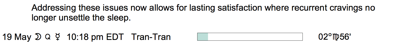 Planet Color Key: The longer the bar, the slower the aspecting planet, and the longer the duration of the planet’s transit.