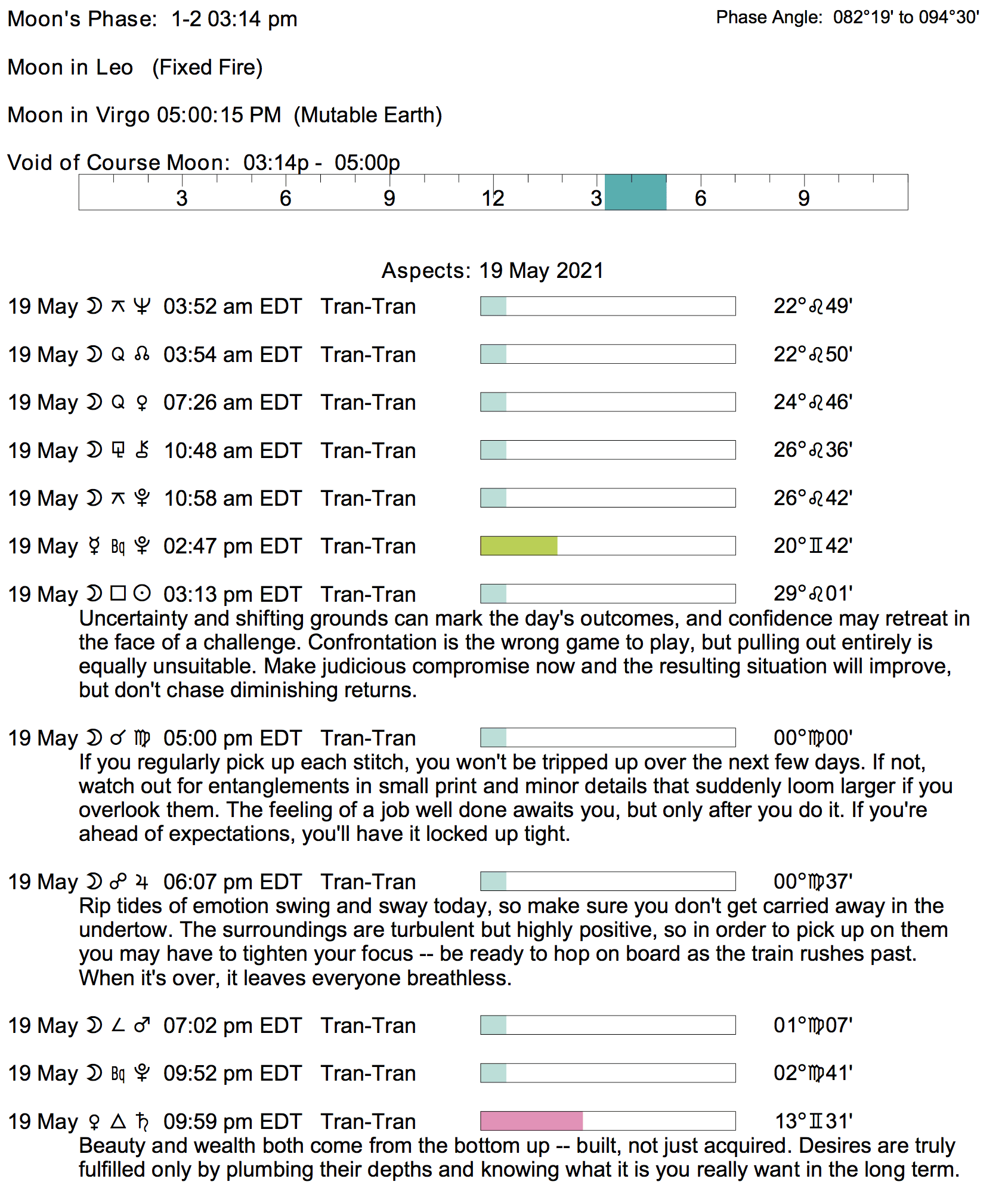- A void Moon period occurs from 3:12 PM to 4:59 PM today.
