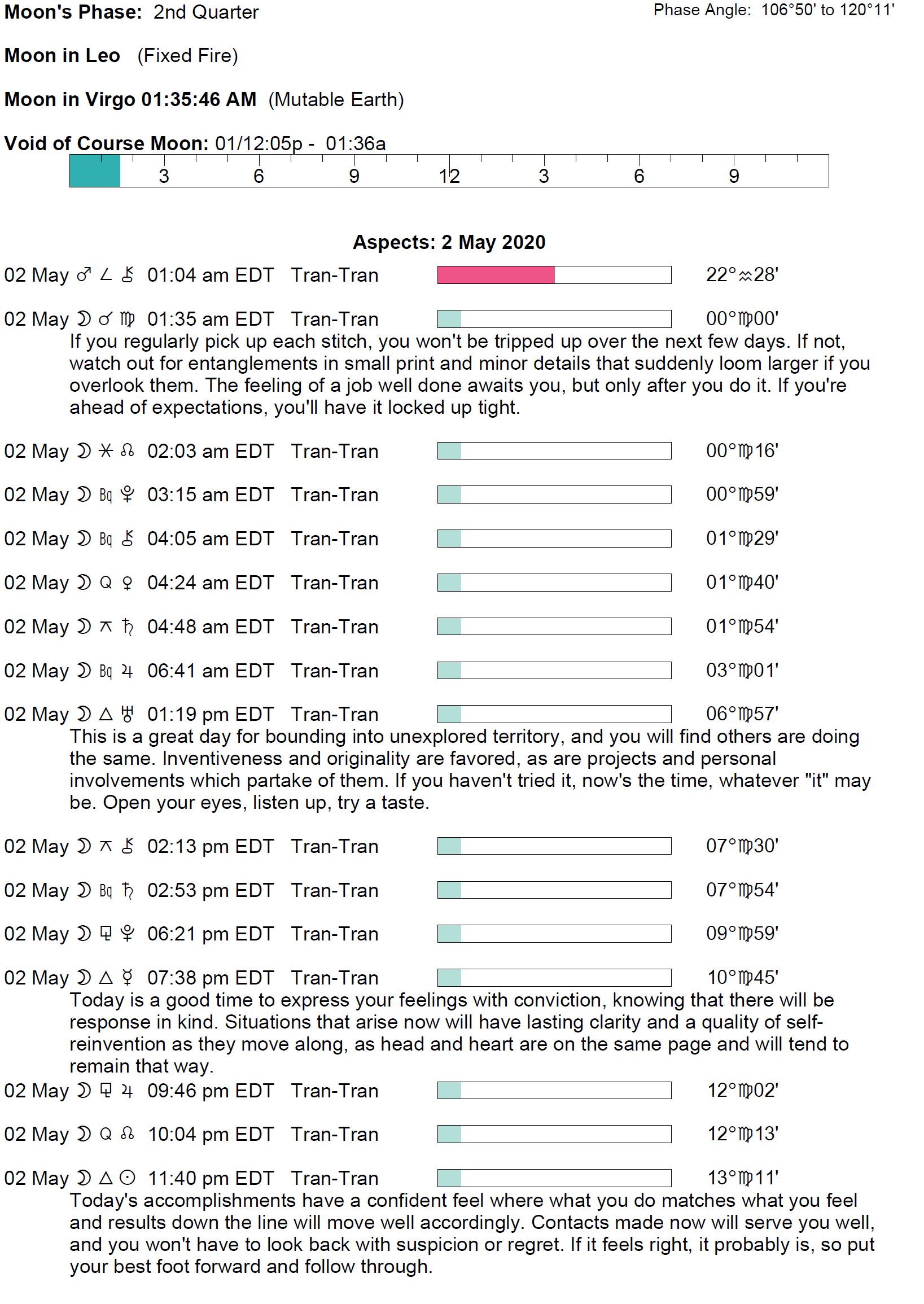 - The void Moon continues until 1:35 AM (since yesterday at 12:04 PM).