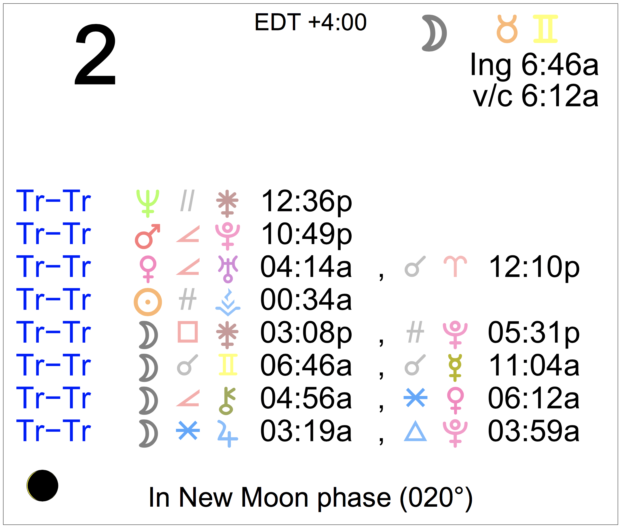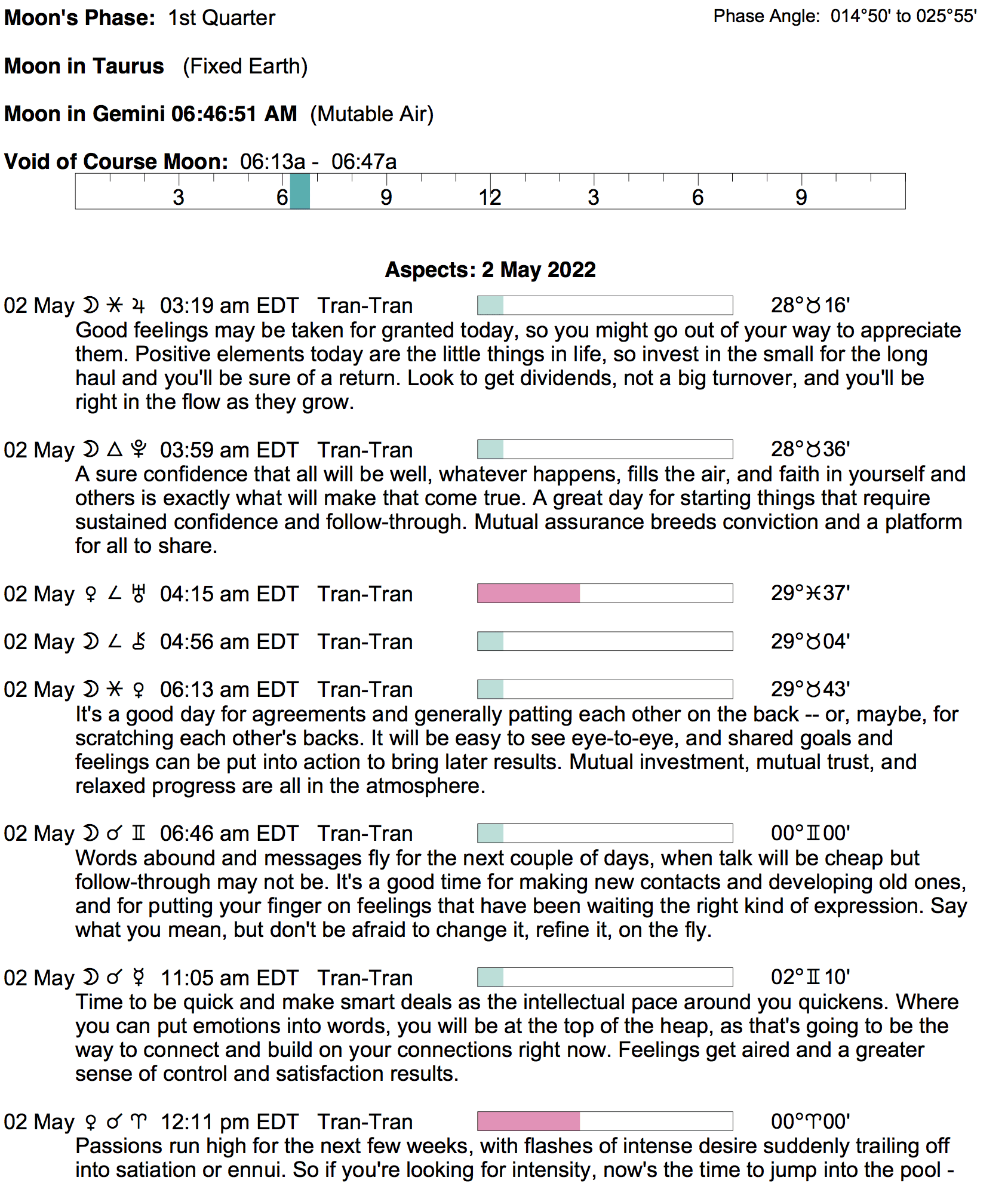 - A void Moon period occurs from 6:12 AM to 6:46 AM today.