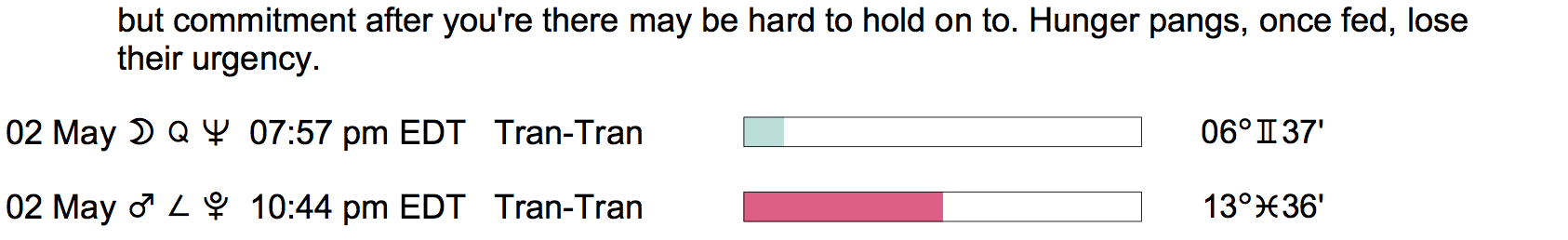 Planet Color Key: The longer the bar, the slower the aspecting planet, and the longer the duration of the planet’s transit.