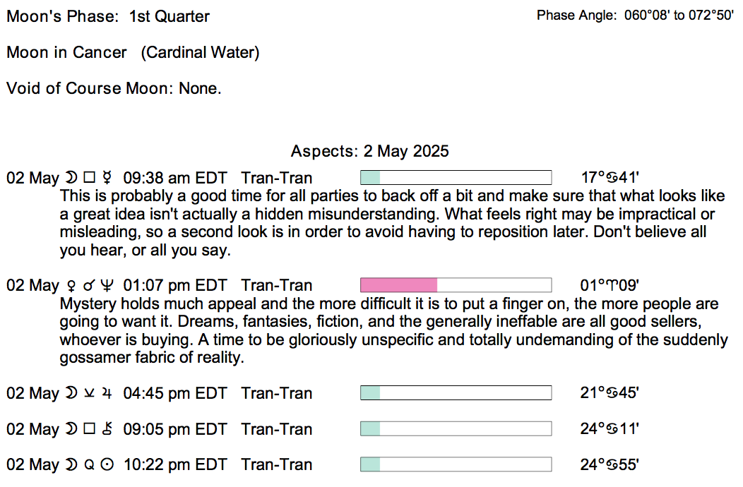 Planet Color Key: The longer the bar, the slower the aspecting planet, and the longer the duration of the planet’s transit.