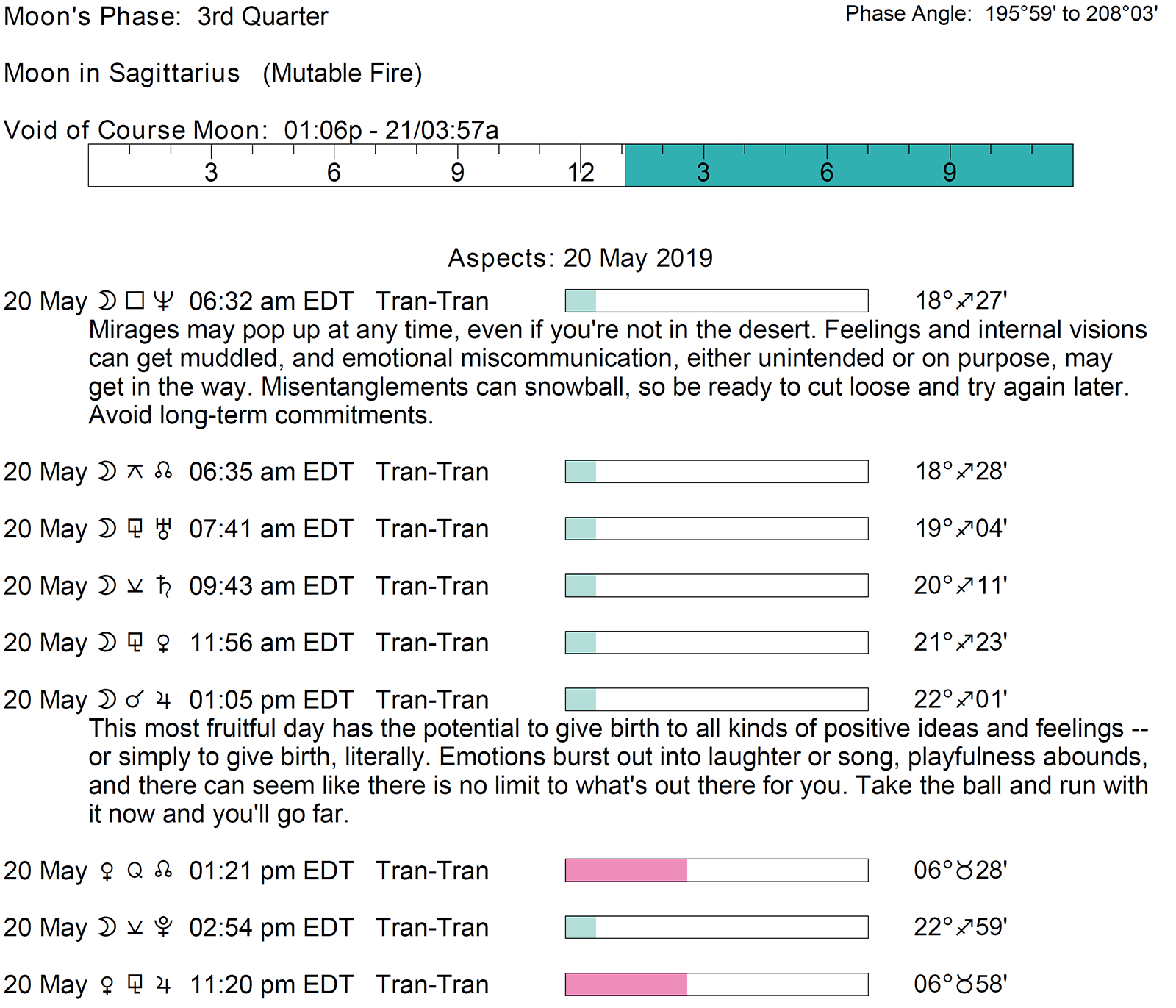 Planet Color Key: The longer the bar, the slower the aspecting planet and the longer the duration of the planet’s transit.