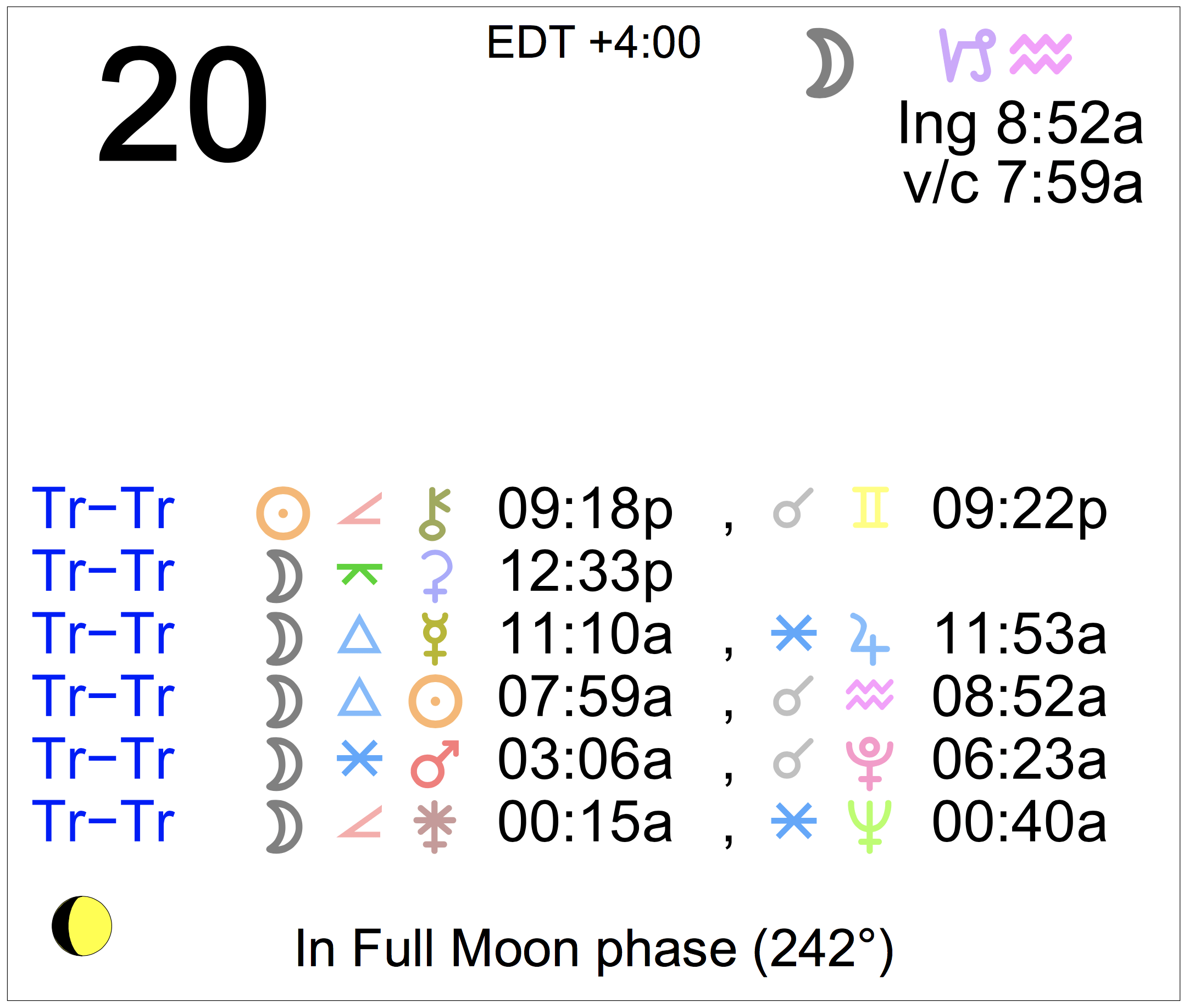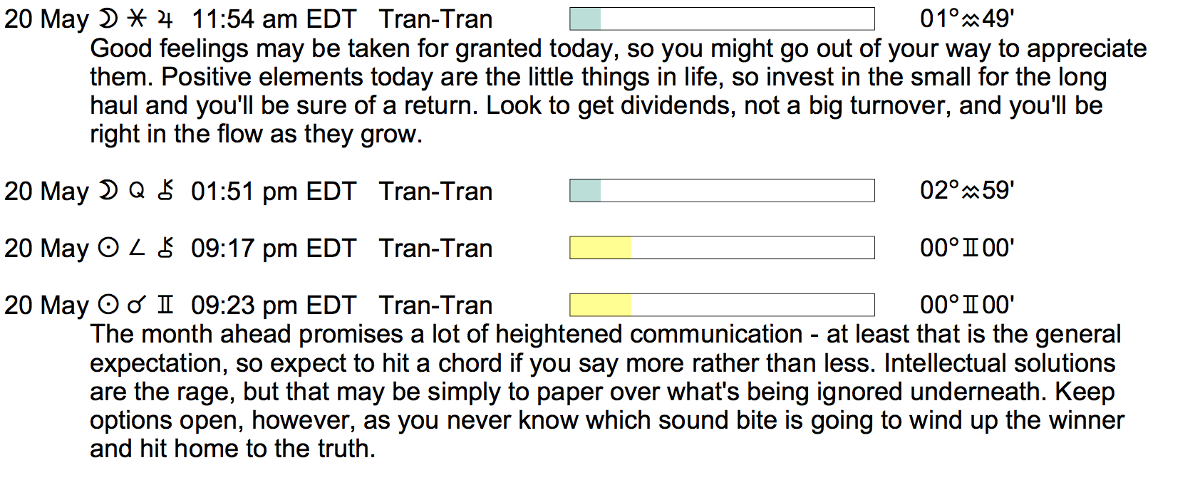Planet Color Key: The longer the bar, the slower the aspecting planet, and the longer the duration of the planet’s transit.