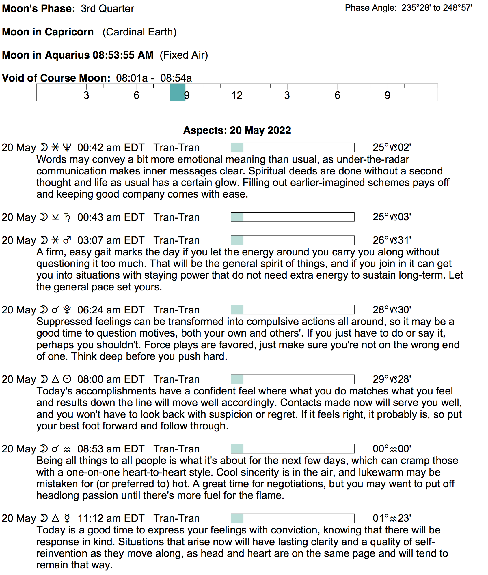 - A void Moon period occurs today from 7:59 AM to 8:52 AM.