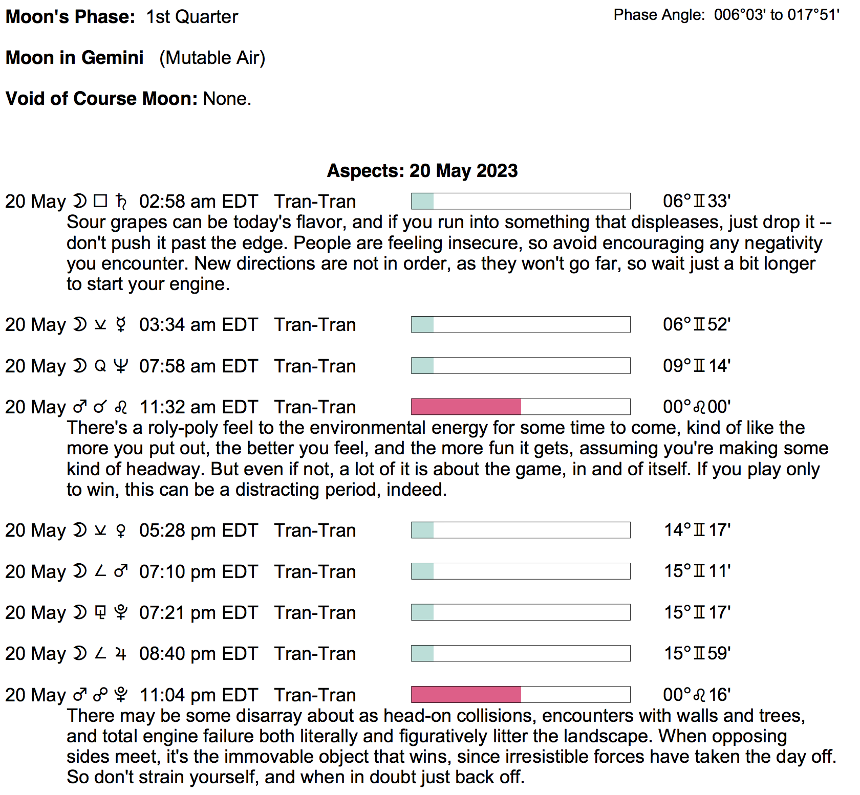 Planet Color Key: The longer the bar, the slower the aspecting planet, and the longer the duration of the planet’s transit.