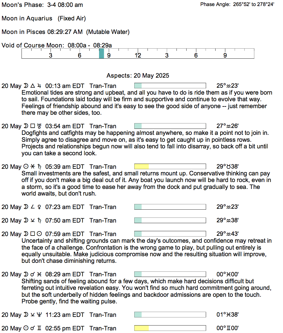 - A void Moon period occurs from 7:58 AM to 8:28 AM today.
