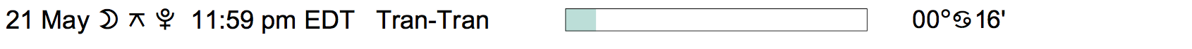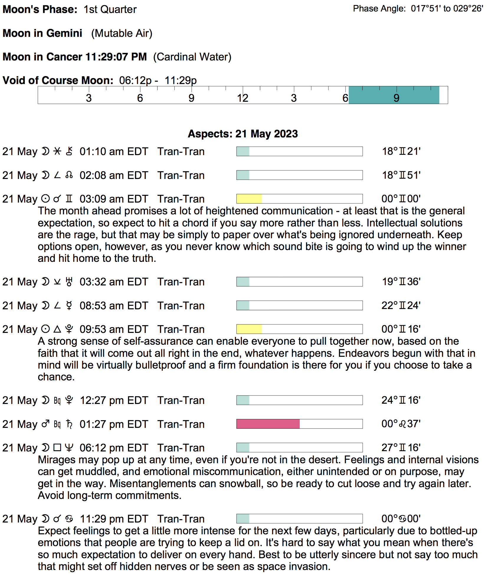 Planet Color Key: The longer the bar, the slower the aspecting planet, and the longer the duration of the planet’s transit.