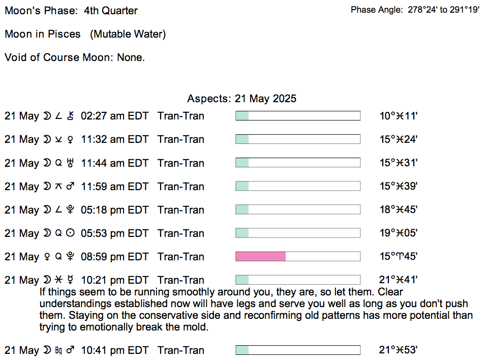 Planet Color Key: The longer the bar, the slower the aspecting planet, and the longer the duration of the planet’s transit.