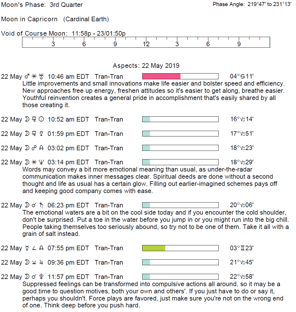 Planet Color Key: The longer the bar, the slower the aspecting planet and the longer the duration of the planet’s transit.