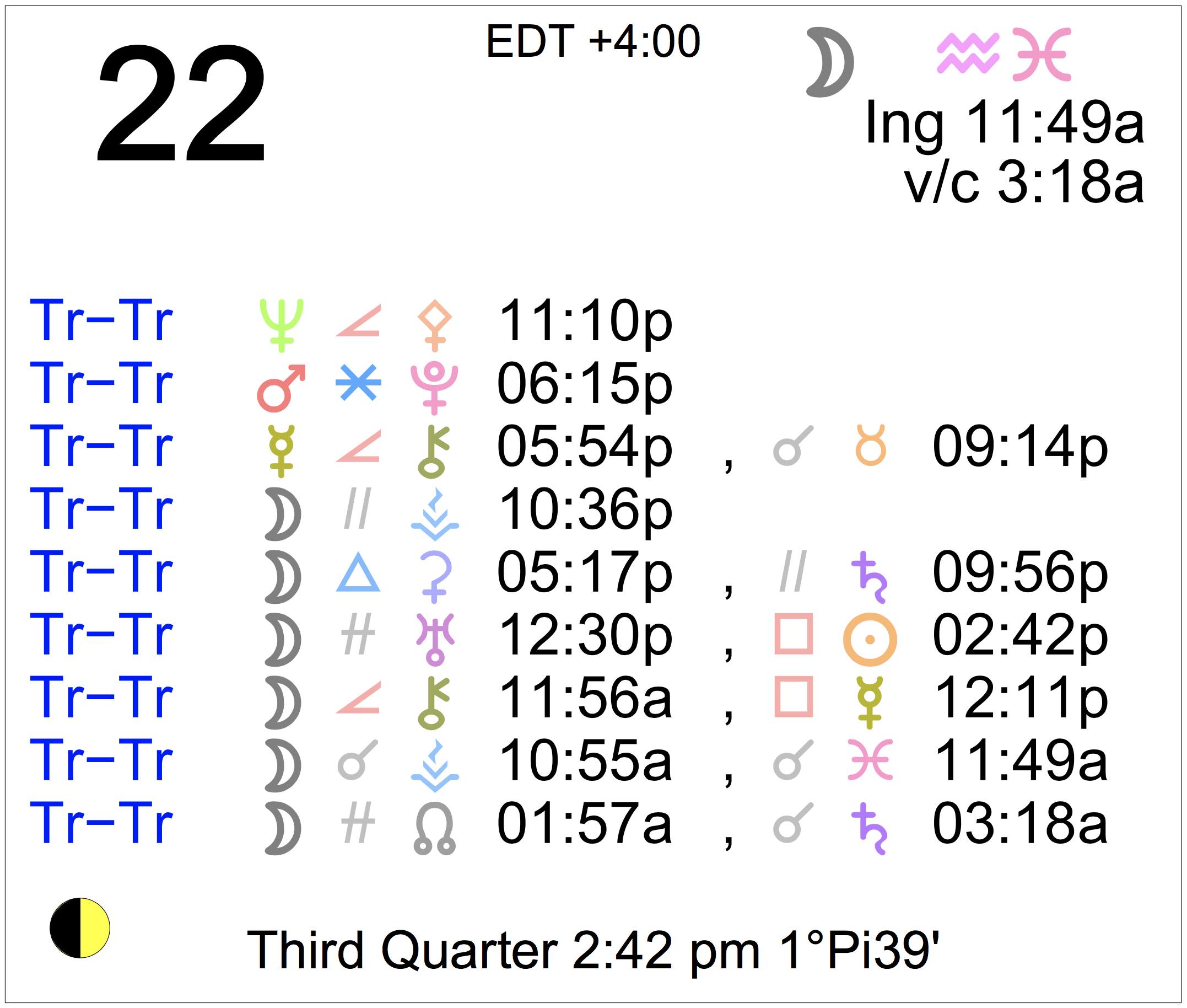 - The Moon is in Aquarius until 11:49 AM, after which the Moon is in Pisces.
