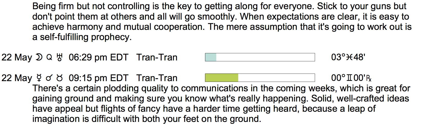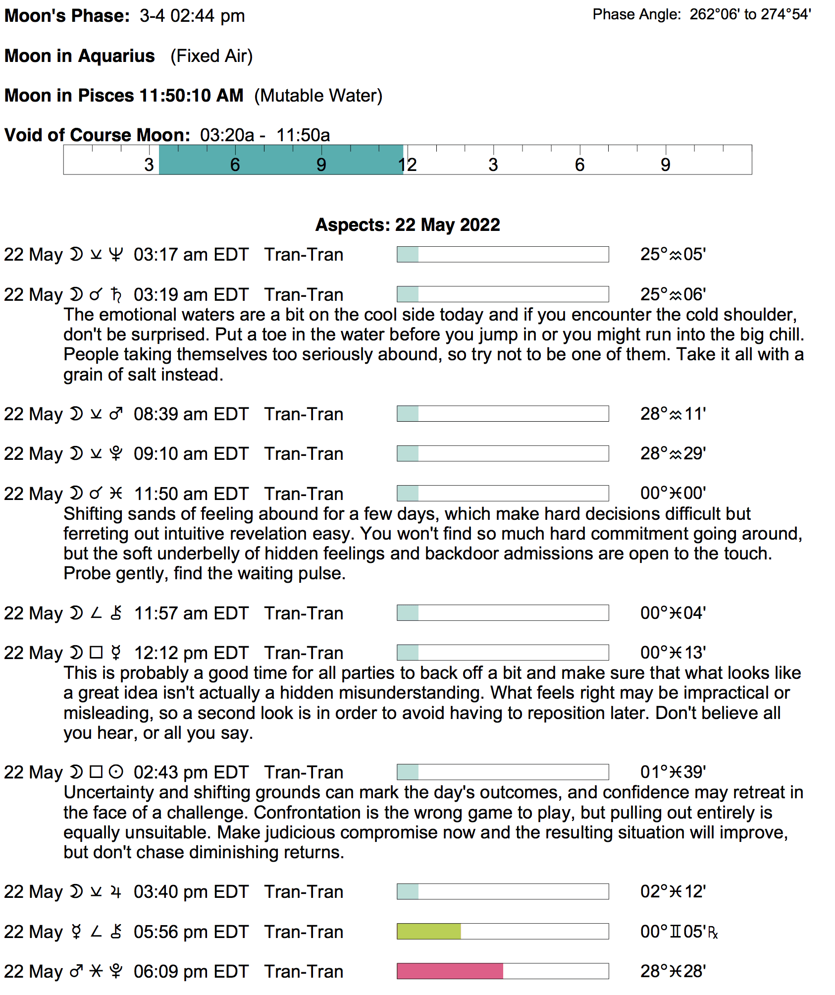 Planet Color Key: The longer the bar, the slower the aspecting planet, and the longer the duration of the planet’s transit.