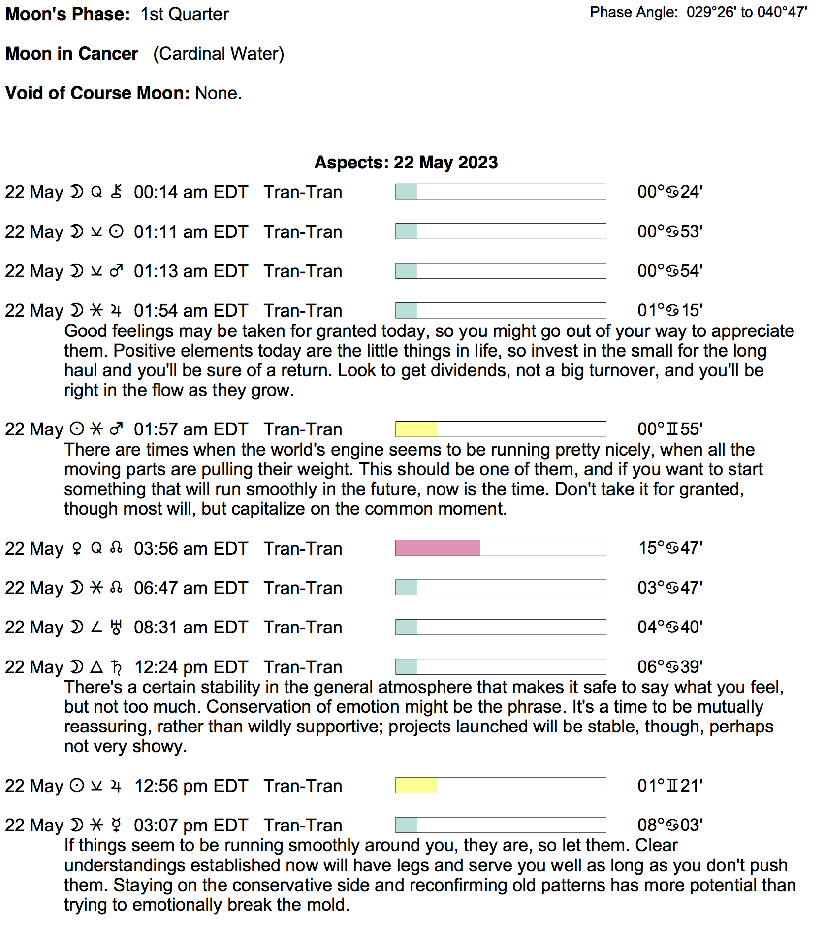 Planet Color Key: The longer the bar, the slower the aspecting planet, and the longer the duration of the planet’s transit.