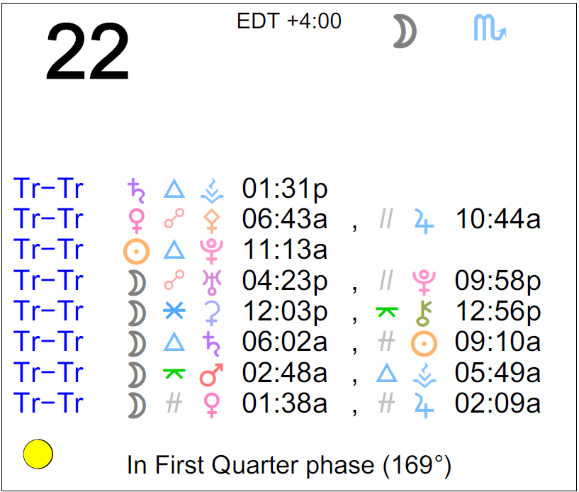 Planet Color Key: The longer the bar, the slower the aspecting planet, and the longer the duration of the planet’s transit.