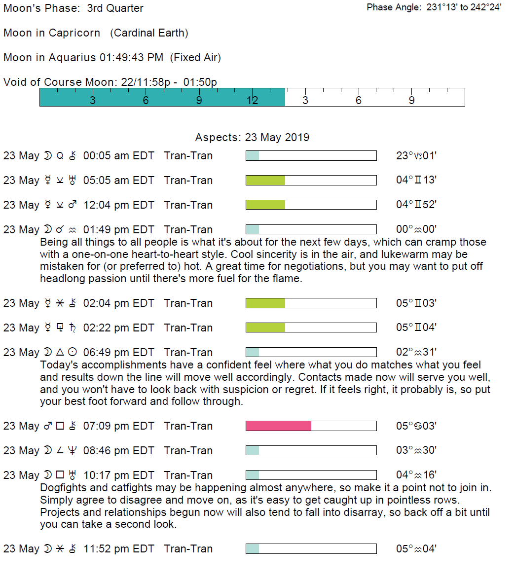 Planet Color Key: The longer the bar, the slower the aspecting planet and the longer the duration of the planet’s transit.