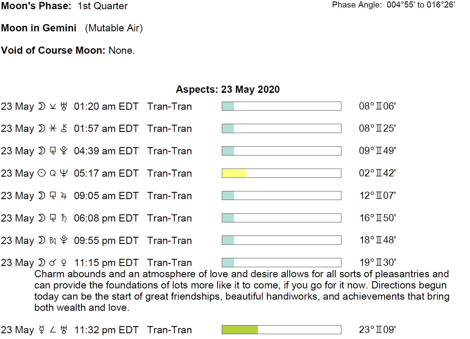 Planet Color Key: The longer the bar, the slower the aspecting planet and the longer the duration of the planet’s transit.