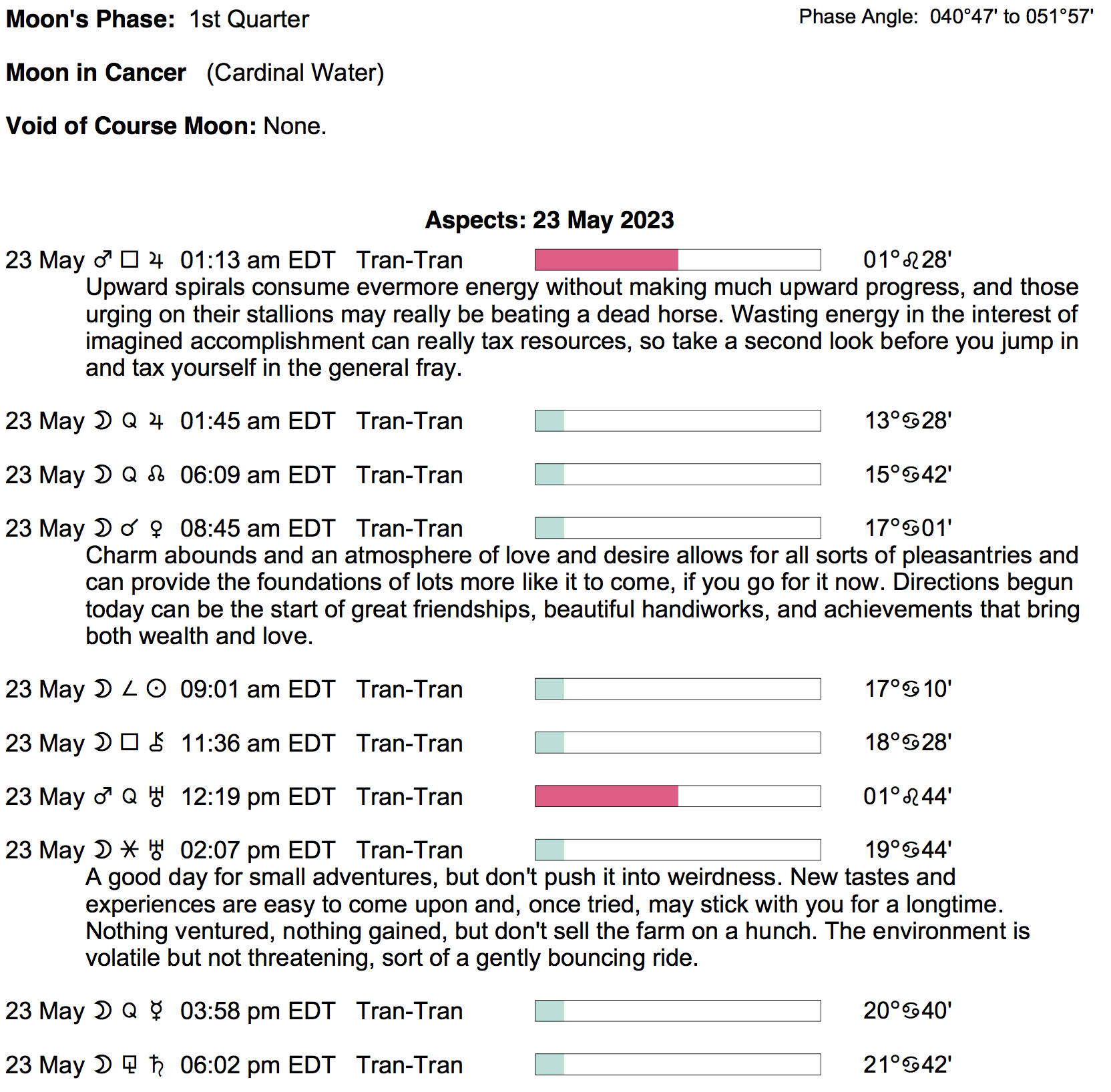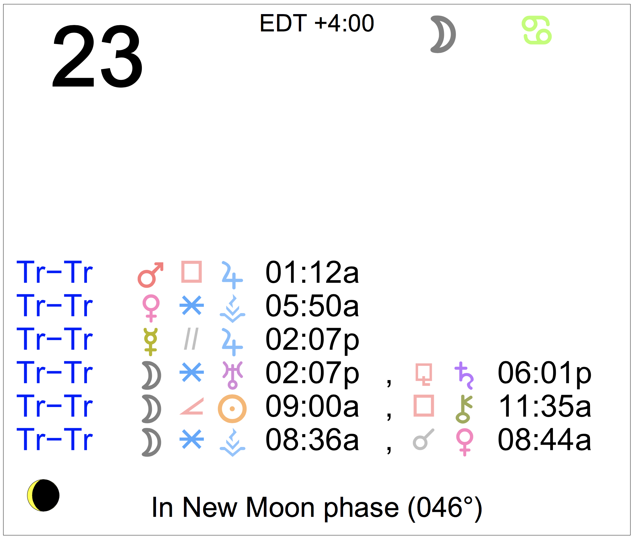 Planet Color Key: The longer the bar, the slower the aspecting planet, and the longer the duration of the planet’s transit.