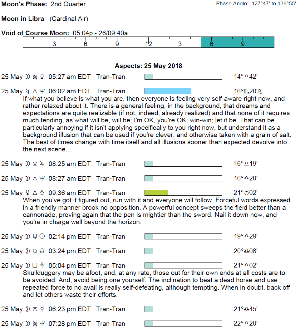 The following aspects (major only) and positions are at noon (EDT) on May 25th: