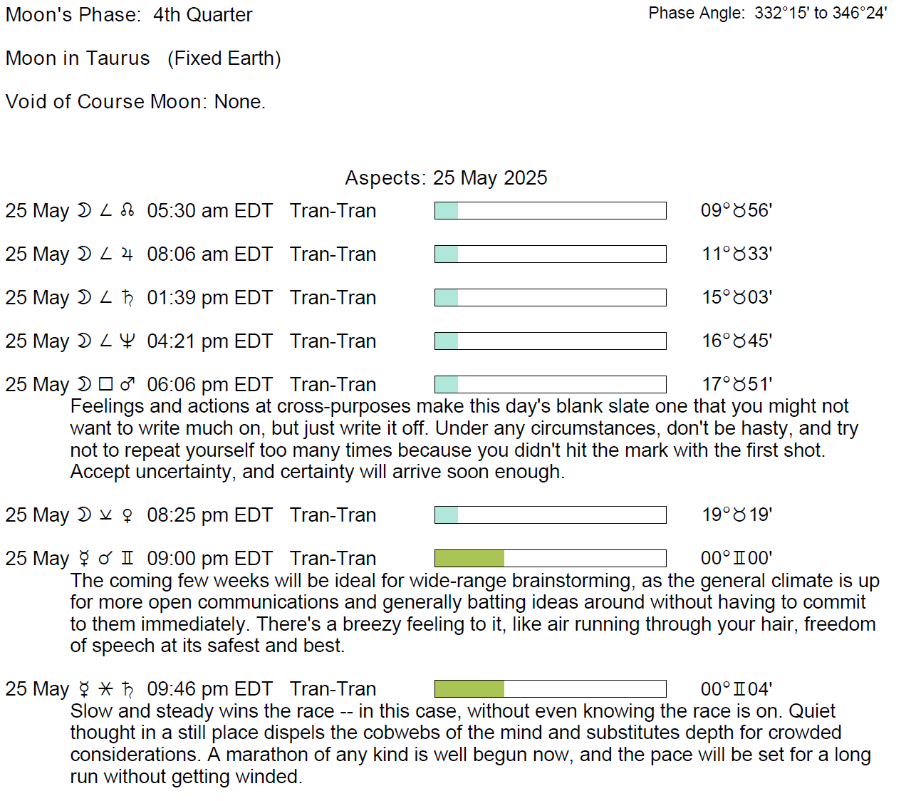 Planet Color Key: The longer the bar, the slower the aspecting planet, and the longer the duration of the planet’s transit.