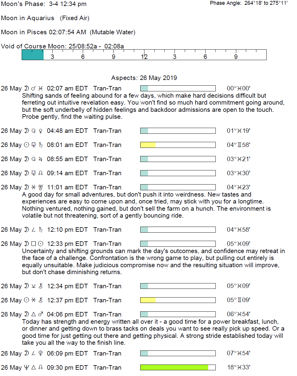 Planet Color Key: The longer the bar, the slower the aspecting planet and the longer the duration of the planet’s transit.