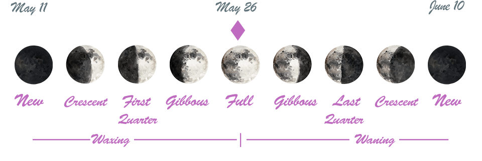 A list of the nearest lunar phases with dates, starting with the New Moon on May 11, 2021
