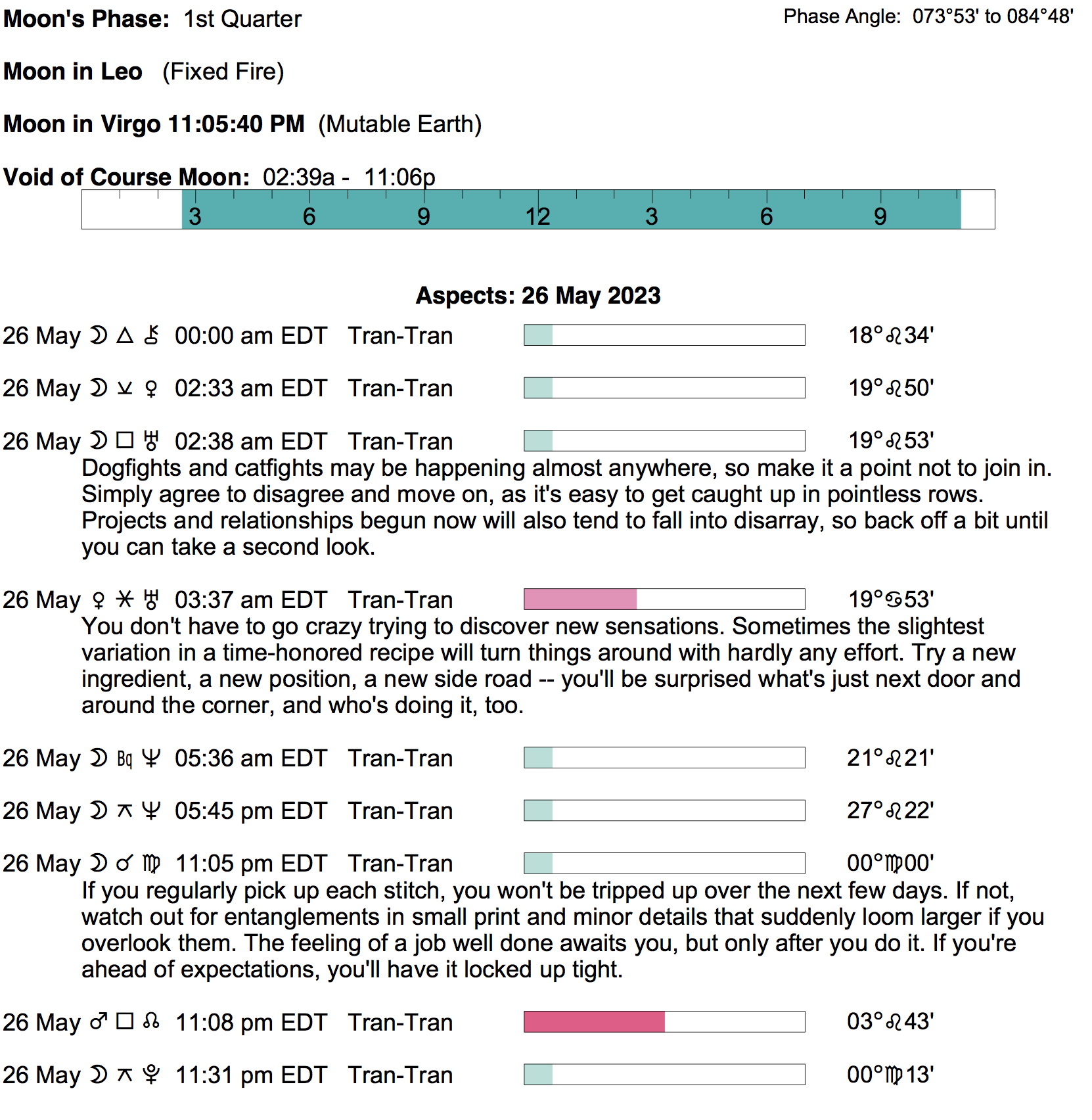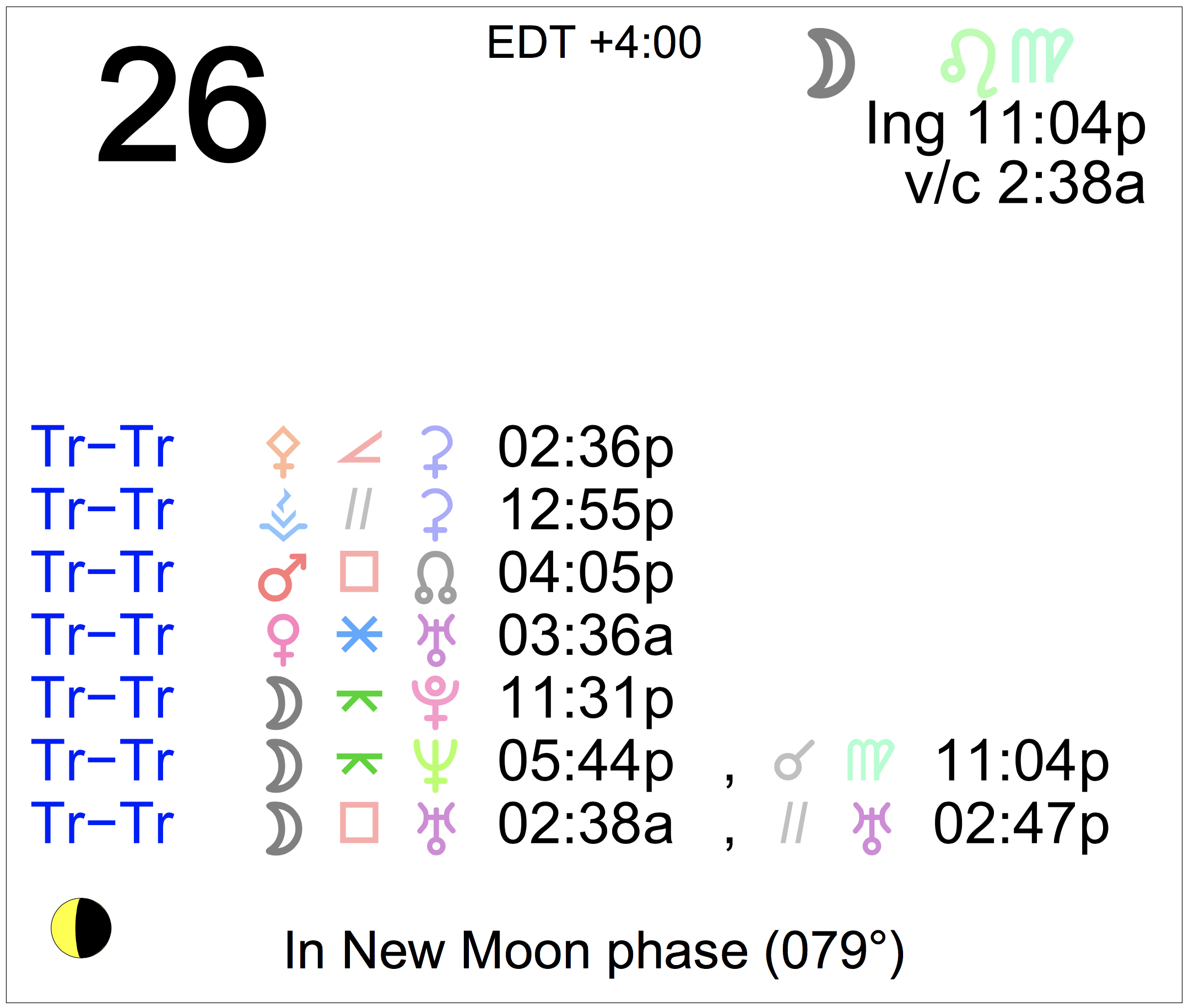 Planet Color Key: The longer the bar, the slower the aspecting planet, and the longer the duration of the planet’s transit.