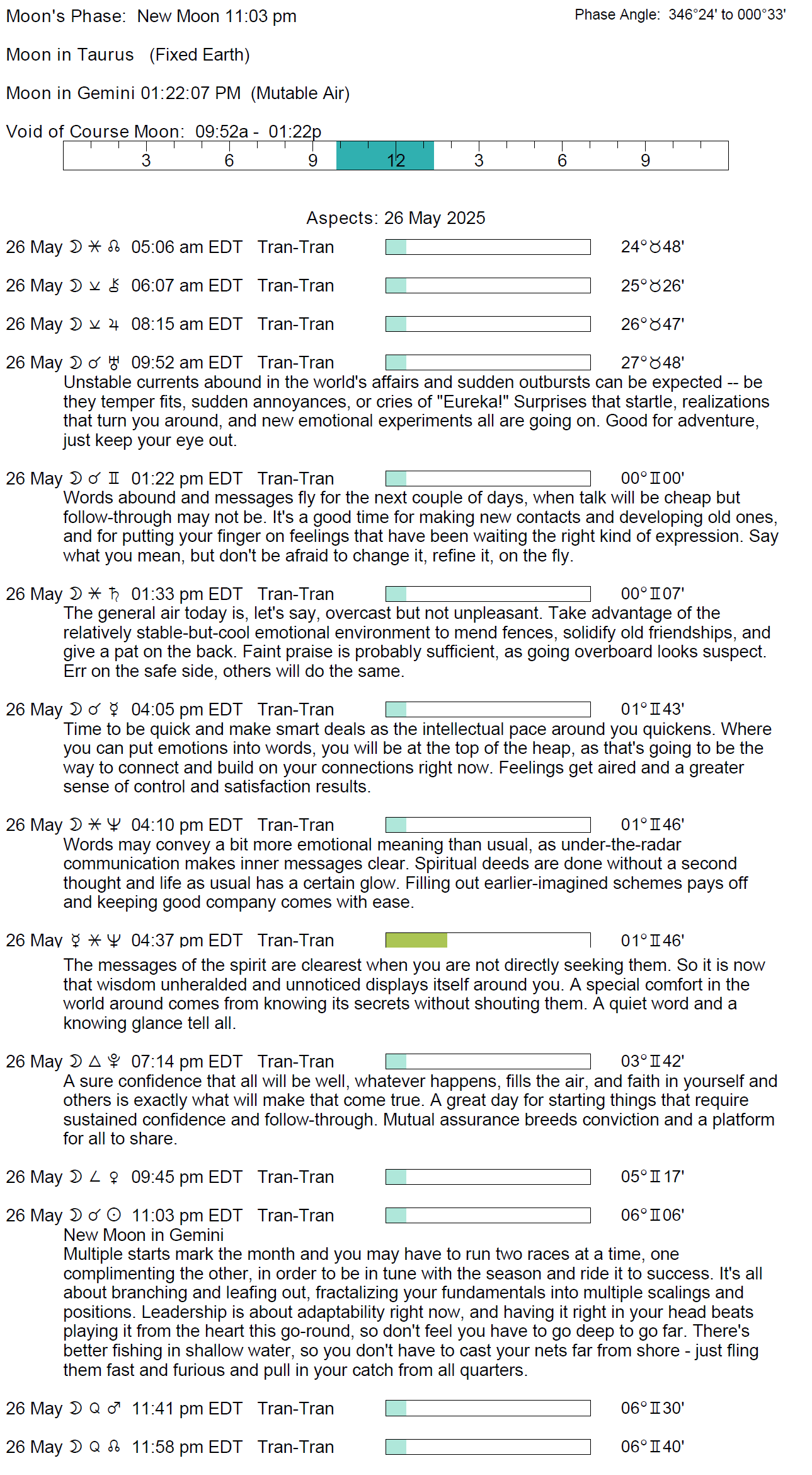 - Today’s void Moon occurs from 9:51 AM to 1:21 PM.