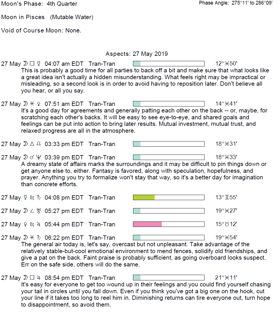 Planet Color Key: The longer the bar, the slower the aspecting planet and the longer the duration of the planet’s transit.