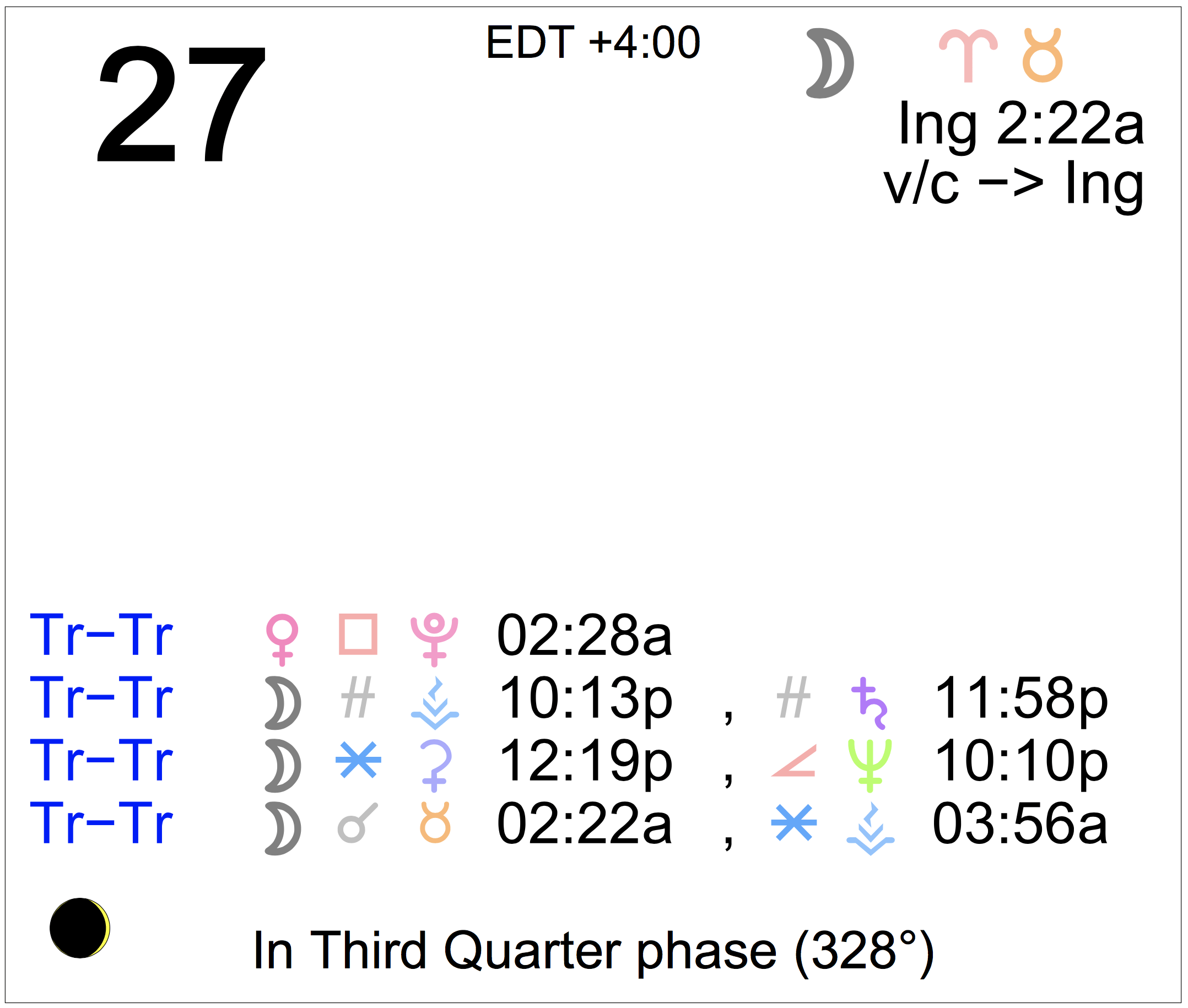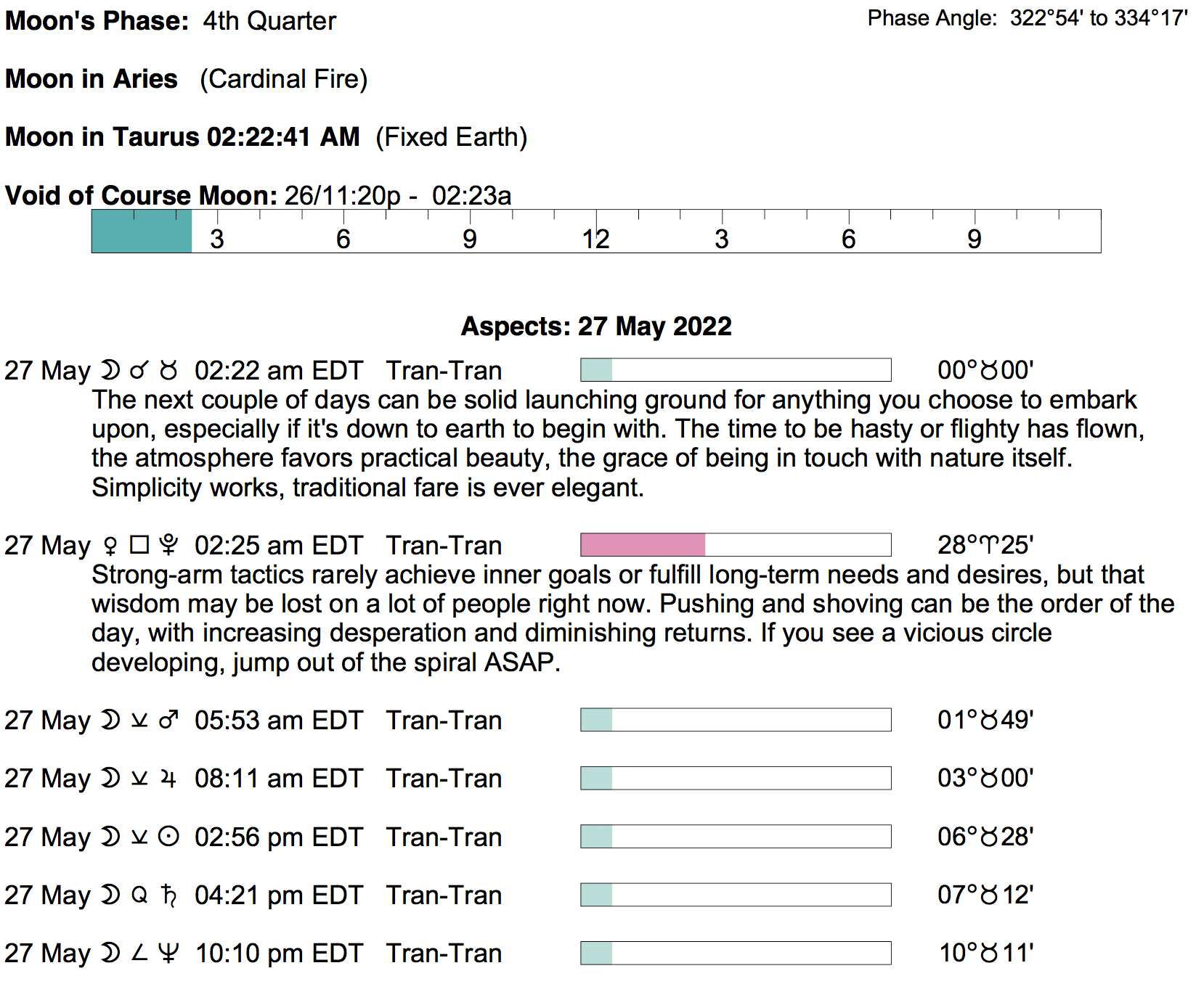 Planet Color Key: The longer the bar, the slower the aspecting planet, and the longer the duration of the planet’s transit.