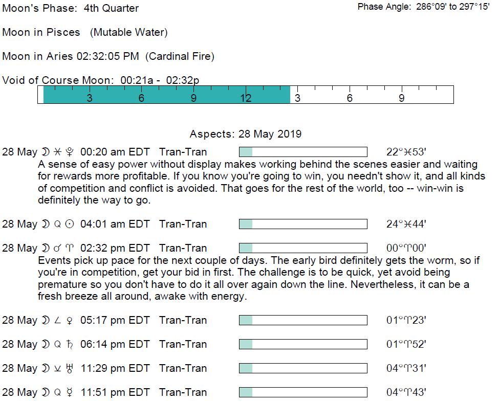 Planet Color Key: The longer the bar, the slower the aspecting planet and the longer the duration of the planet’s transit.