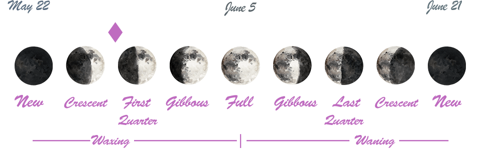 - The New Moon occurred on the 22nd in the sign of Gemini, and the First Quarter Moon will occur tomorrow
