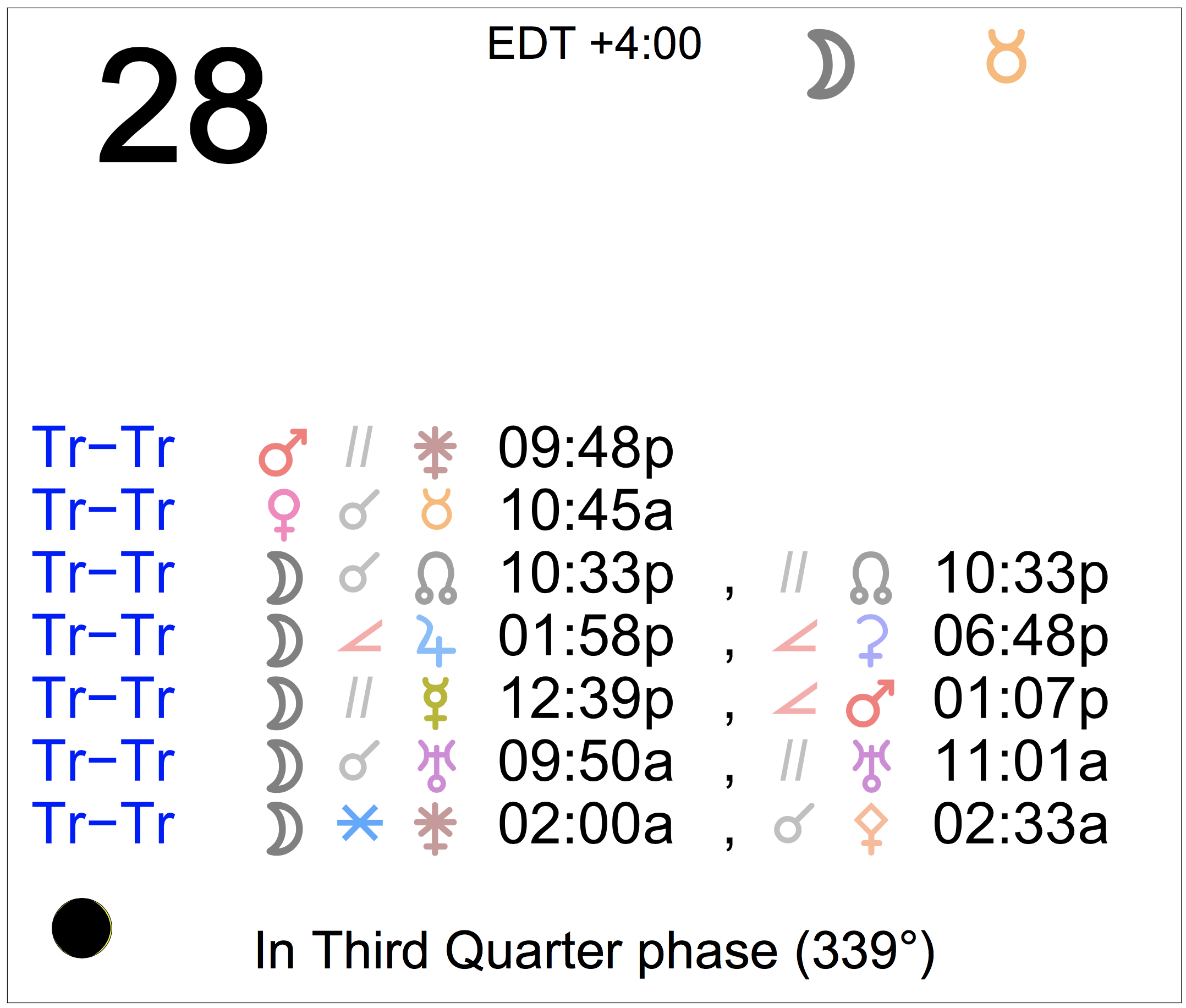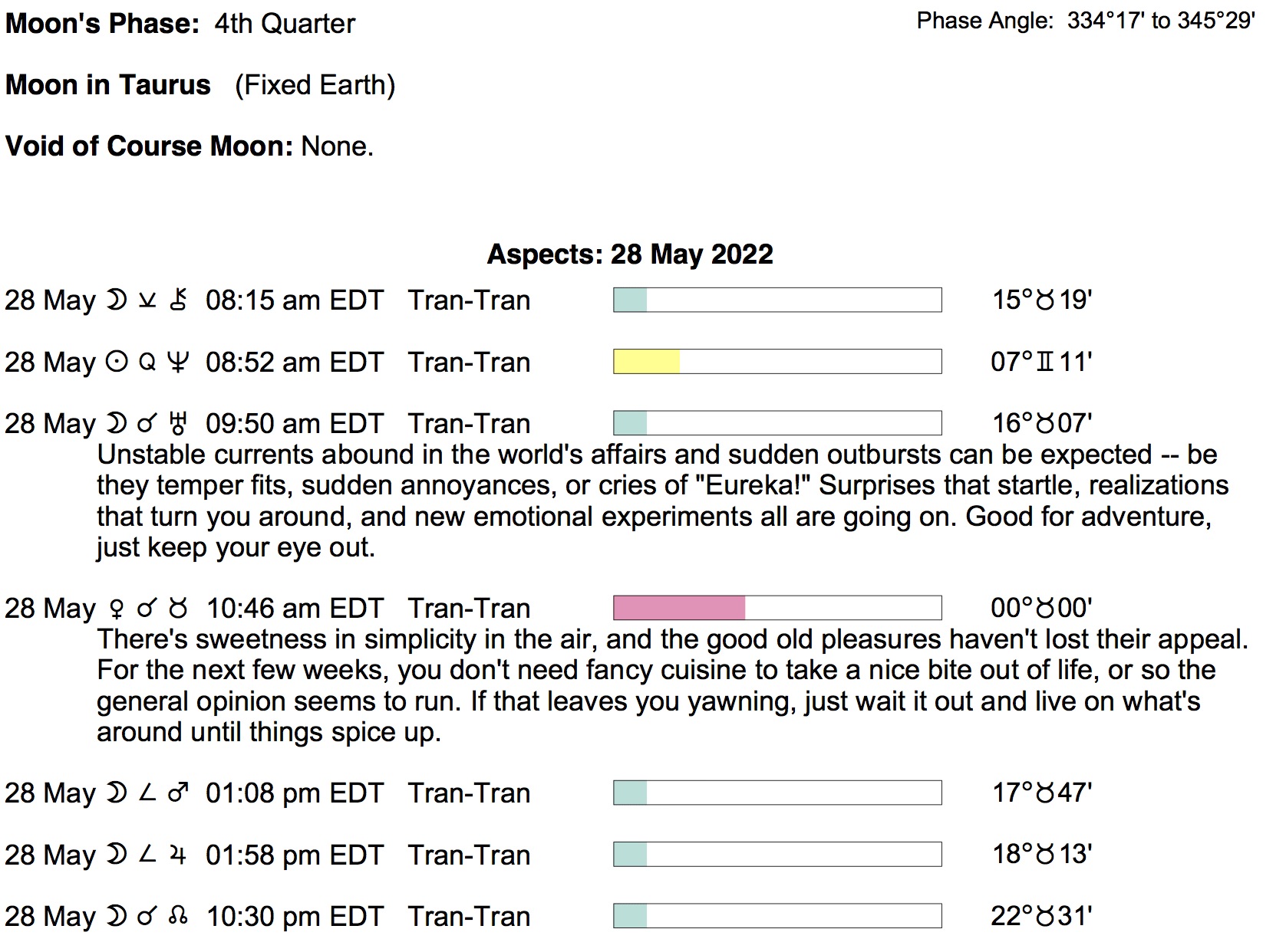 Planet Color Key: The longer the bar, the slower the aspecting planet, and the longer the duration of the planet’s transit.