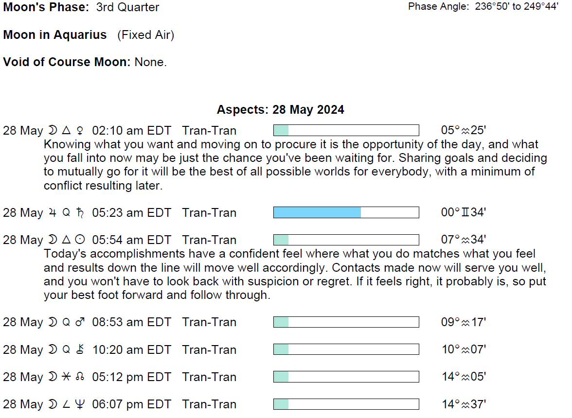 Planet Color Key: The longer the bar, the slower the aspecting planet, and the longer the duration of the planet’s transit.