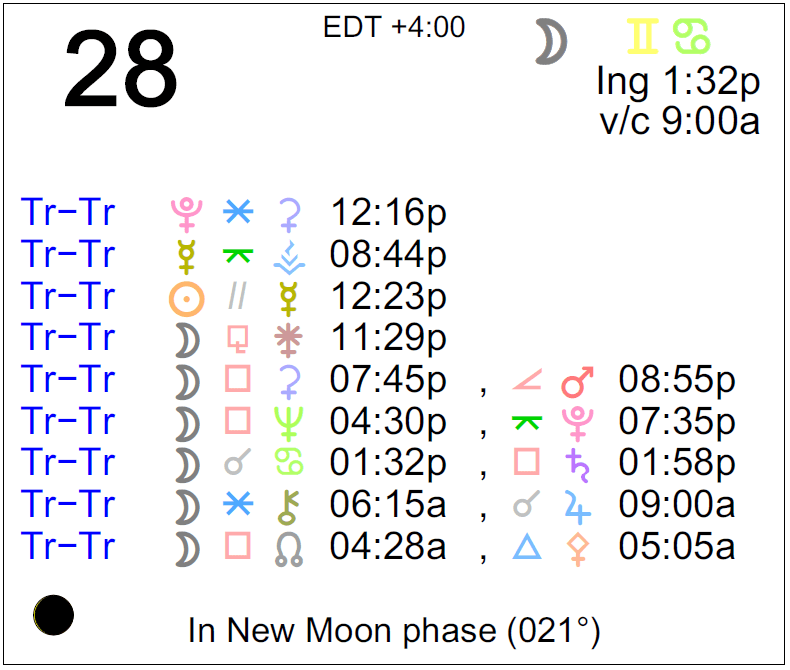 Planet Color Key: The longer the bar, the slower the aspecting planet, and the longer the duration of the planet’s transit.