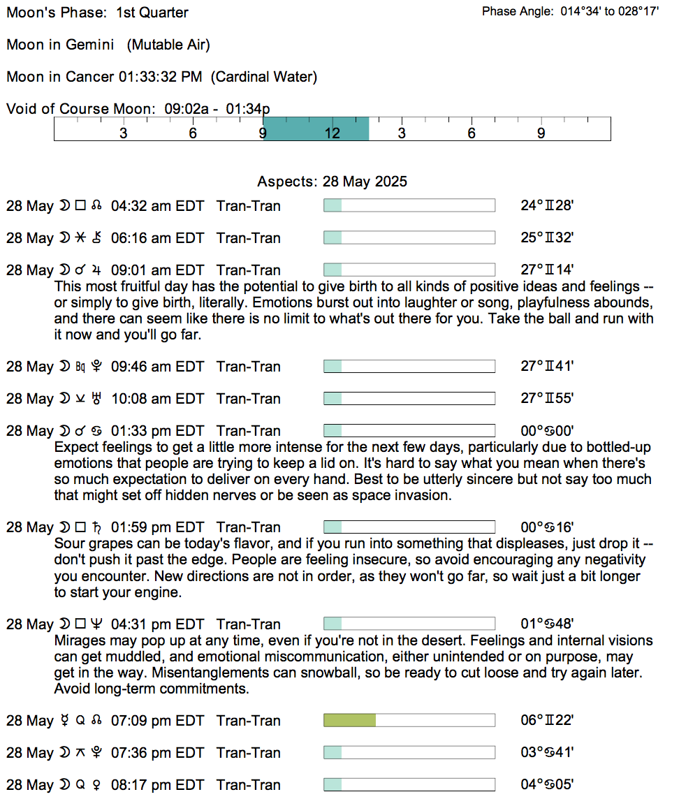 - The Moon is in Gemini until 1:32 PM, from which time the Moon is in Cancer.
