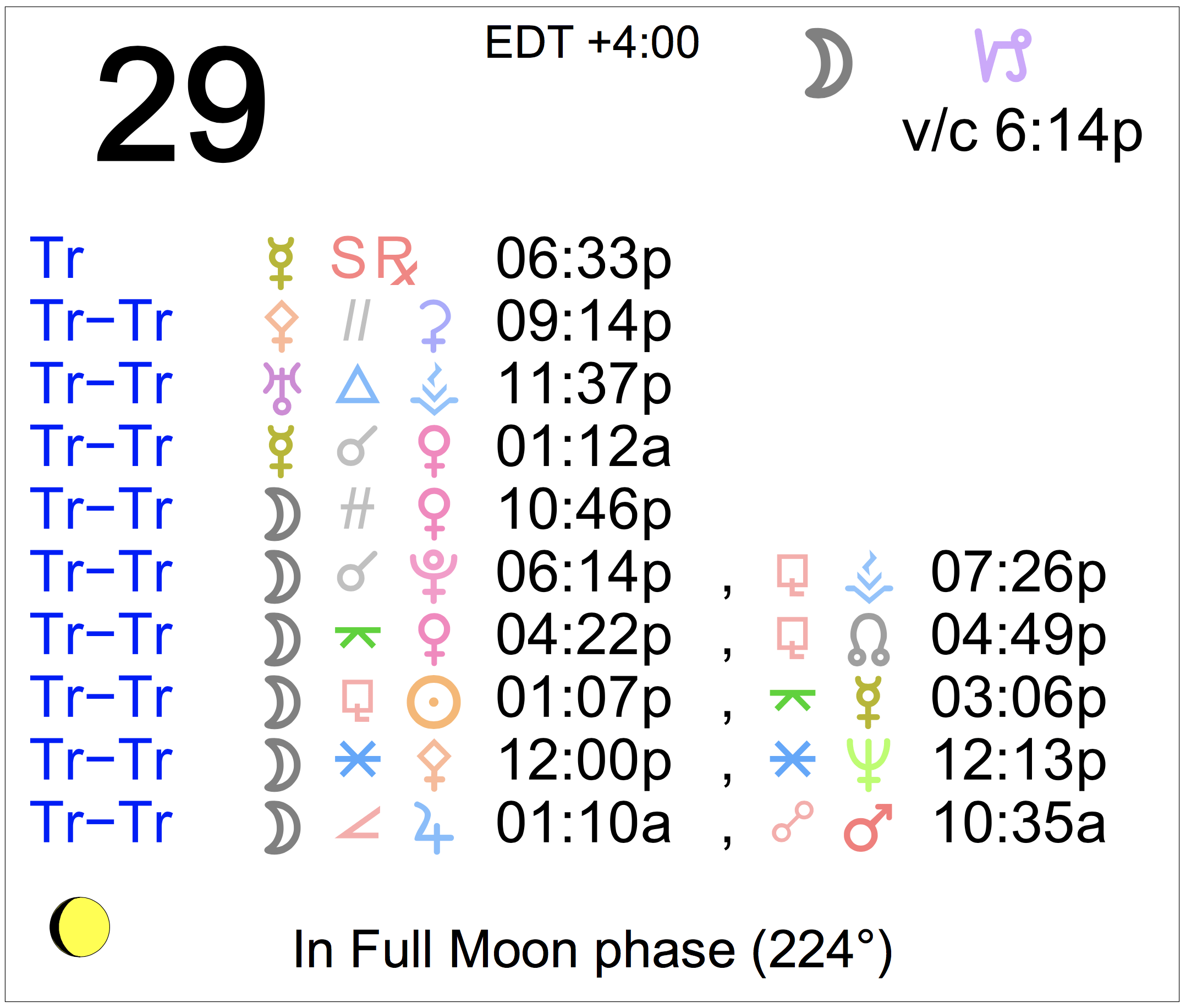 Planet Color Key: The longer the bar, the slower the aspecting planet, and the longer the duration of the planet’s transit.