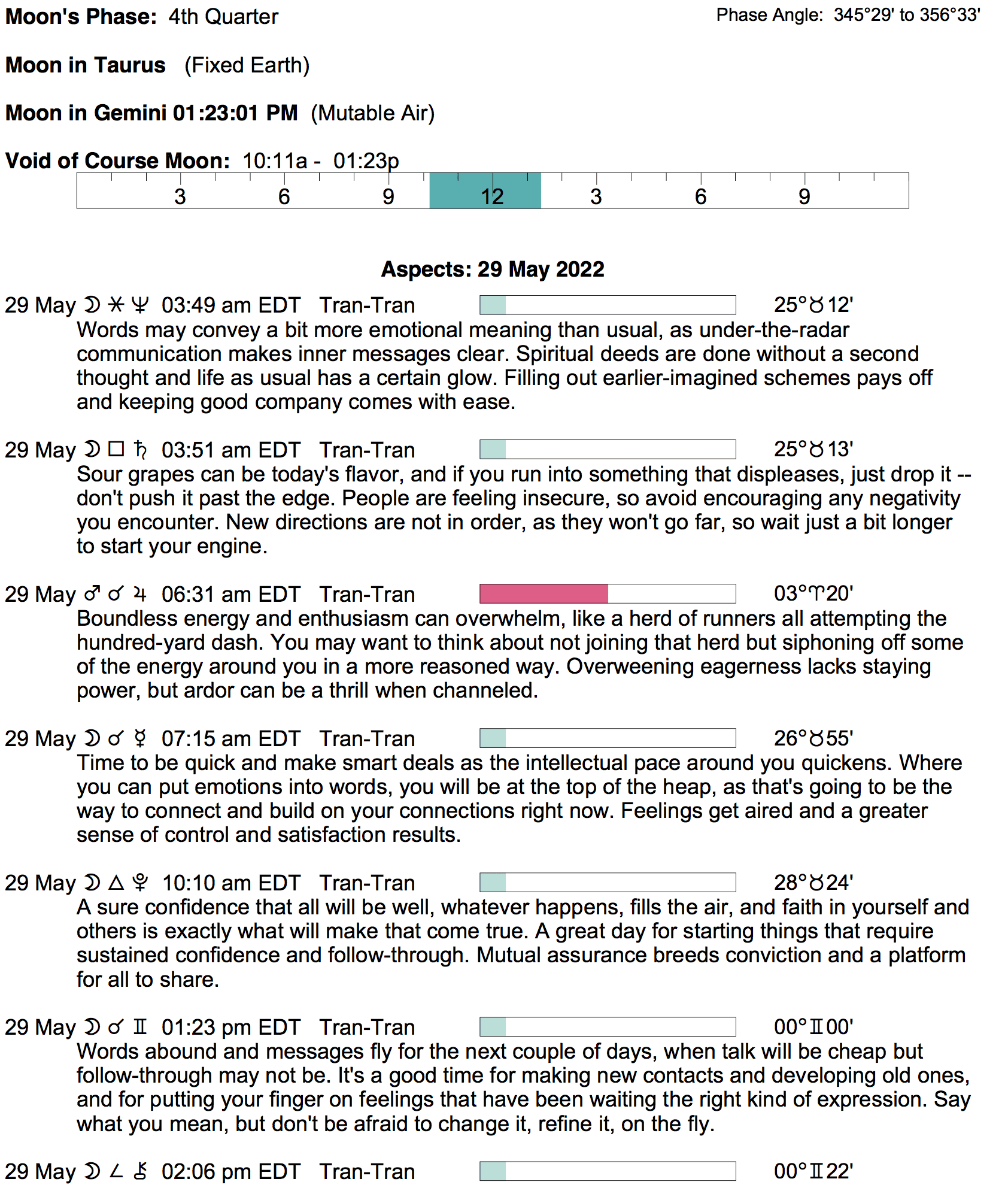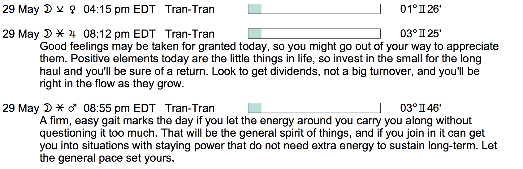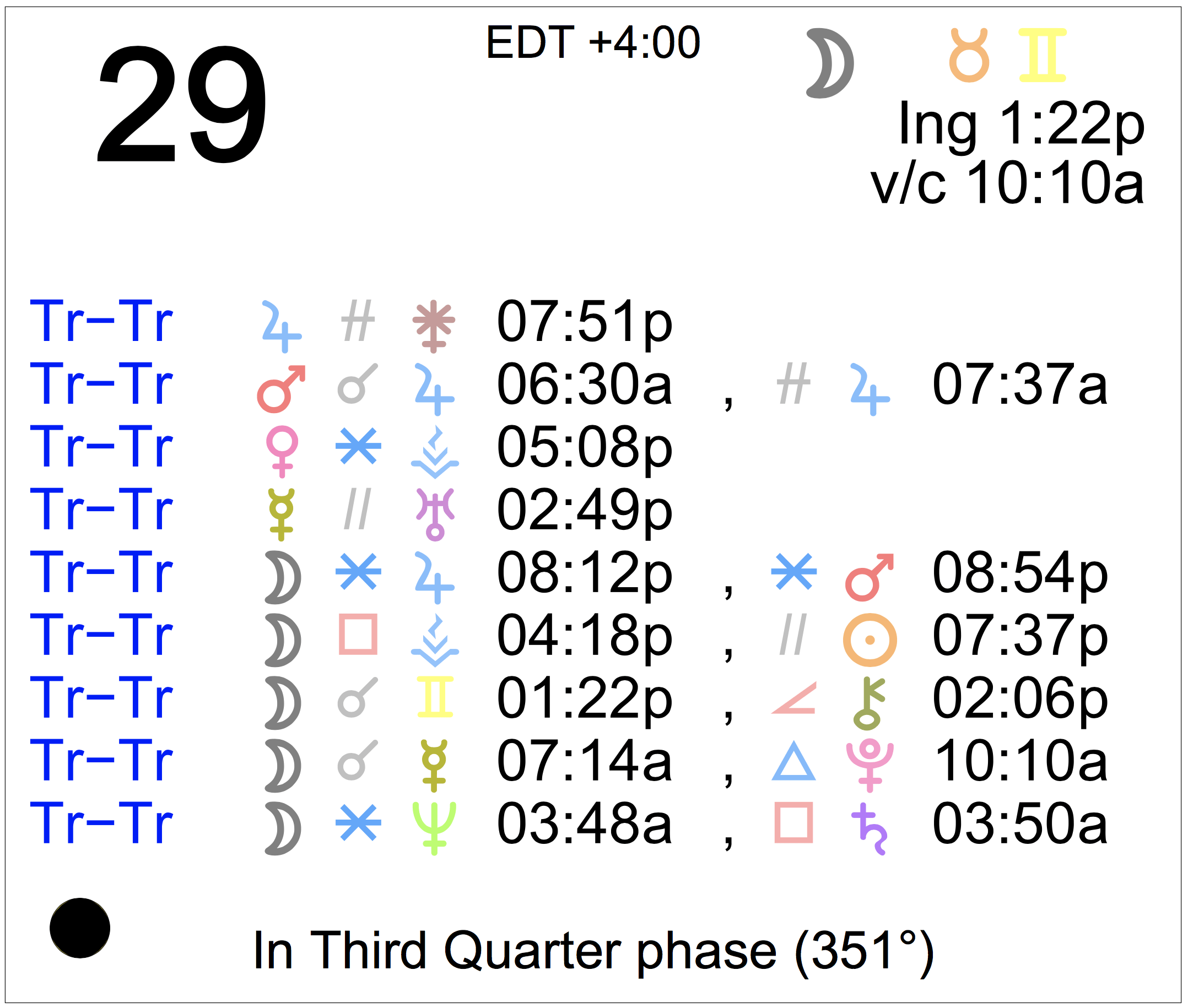 Planet Color Key: The longer the bar, the slower the aspecting planet, and the longer the duration of the planet’s transit.
