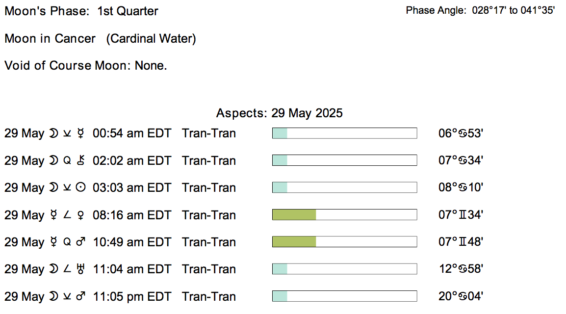 Planet Color Key: The longer the bar, the slower the aspecting planet, and the longer the duration of the planet’s transit.