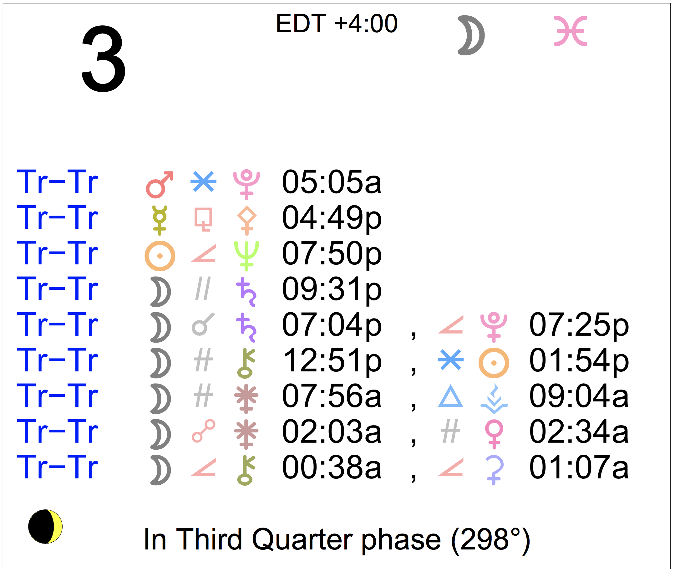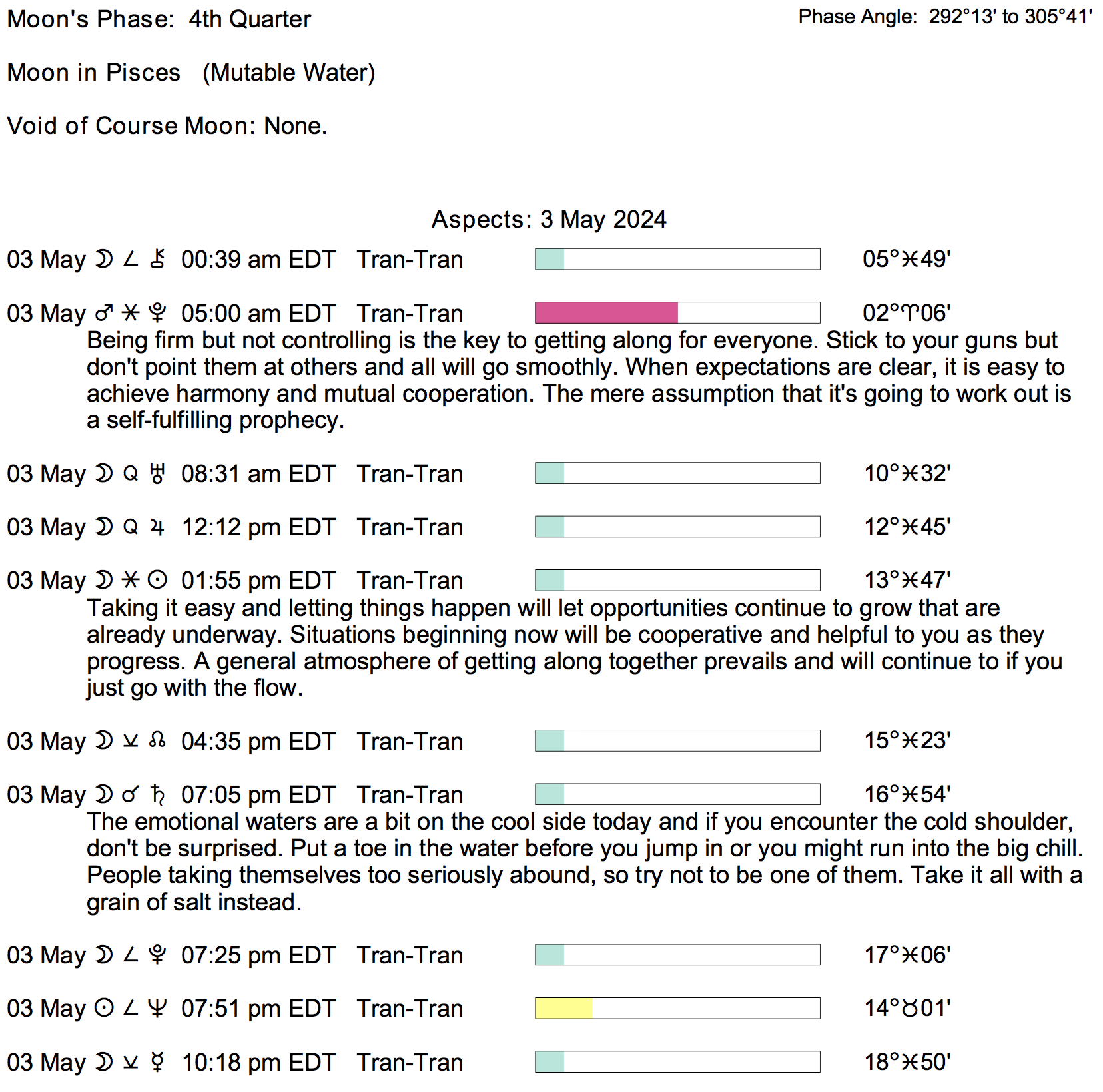 Planet Color Key: The longer the bar, the slower the aspecting planet, and the longer the duration of the planet’s transit.