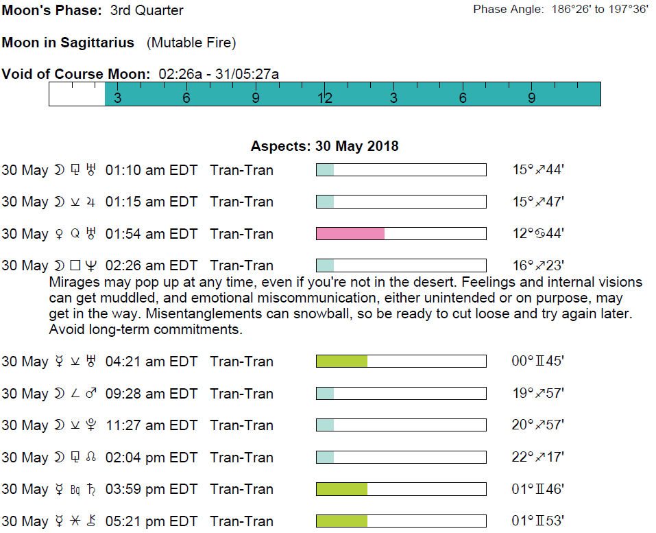 The following aspects (major only) and positions are at noon (EDT) on May 30th: