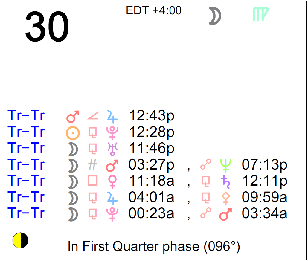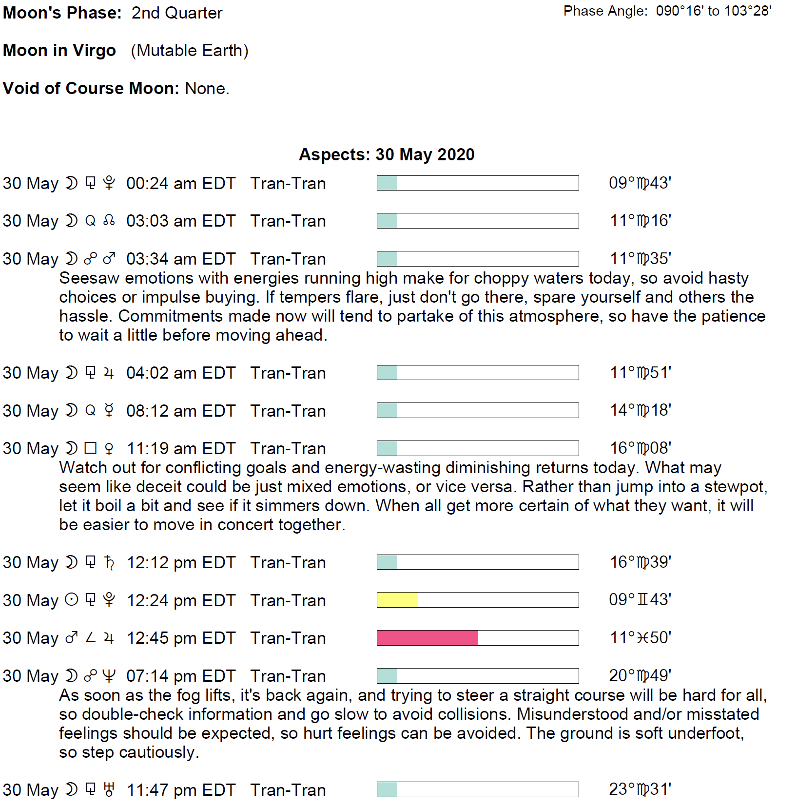 Planet Color Key: The longer the bar, the slower the aspecting planet and the longer the duration of the planet’s transit.