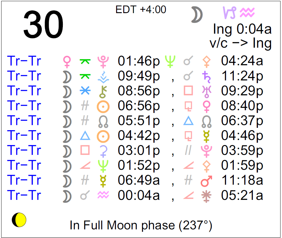 Planet Color Key: The longer the bar, the slower the aspecting planet, and the longer the duration of the planet’s transit.