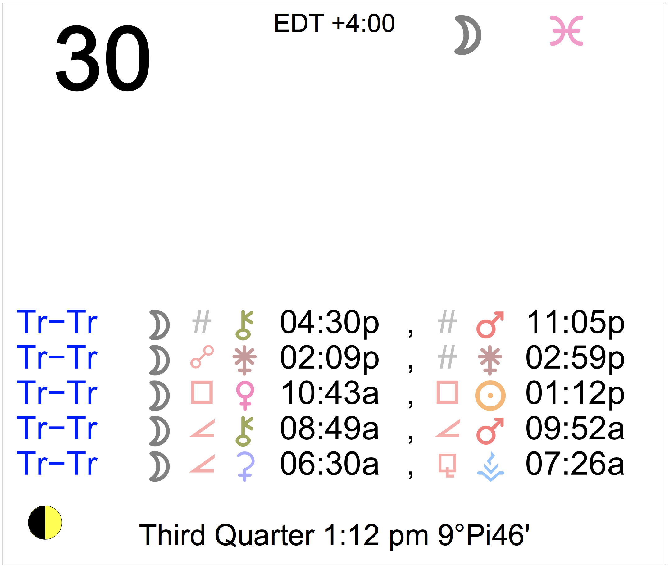 - The Last Quarter Moon occurs today at 1:12 PM.