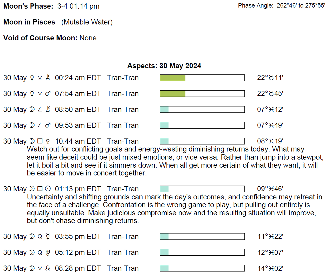 Planet Color Key: The longer the bar, the slower the aspecting planet, and the longer the duration of the planet’s transit.