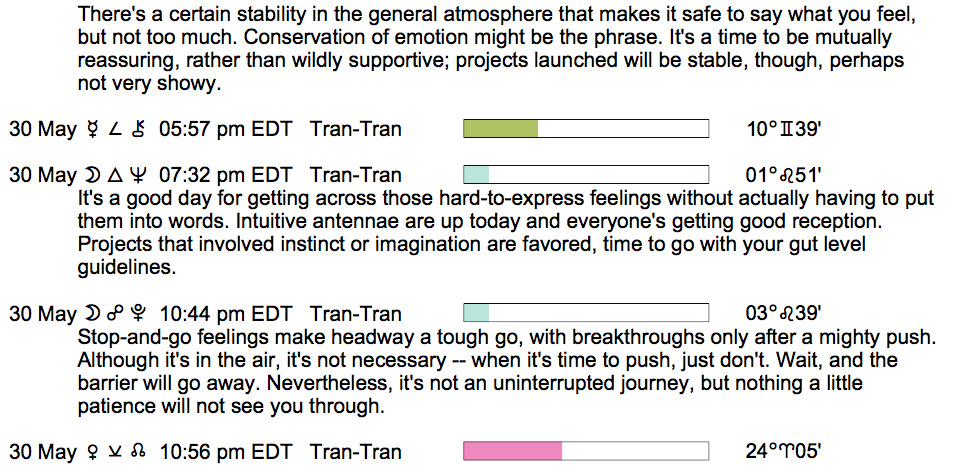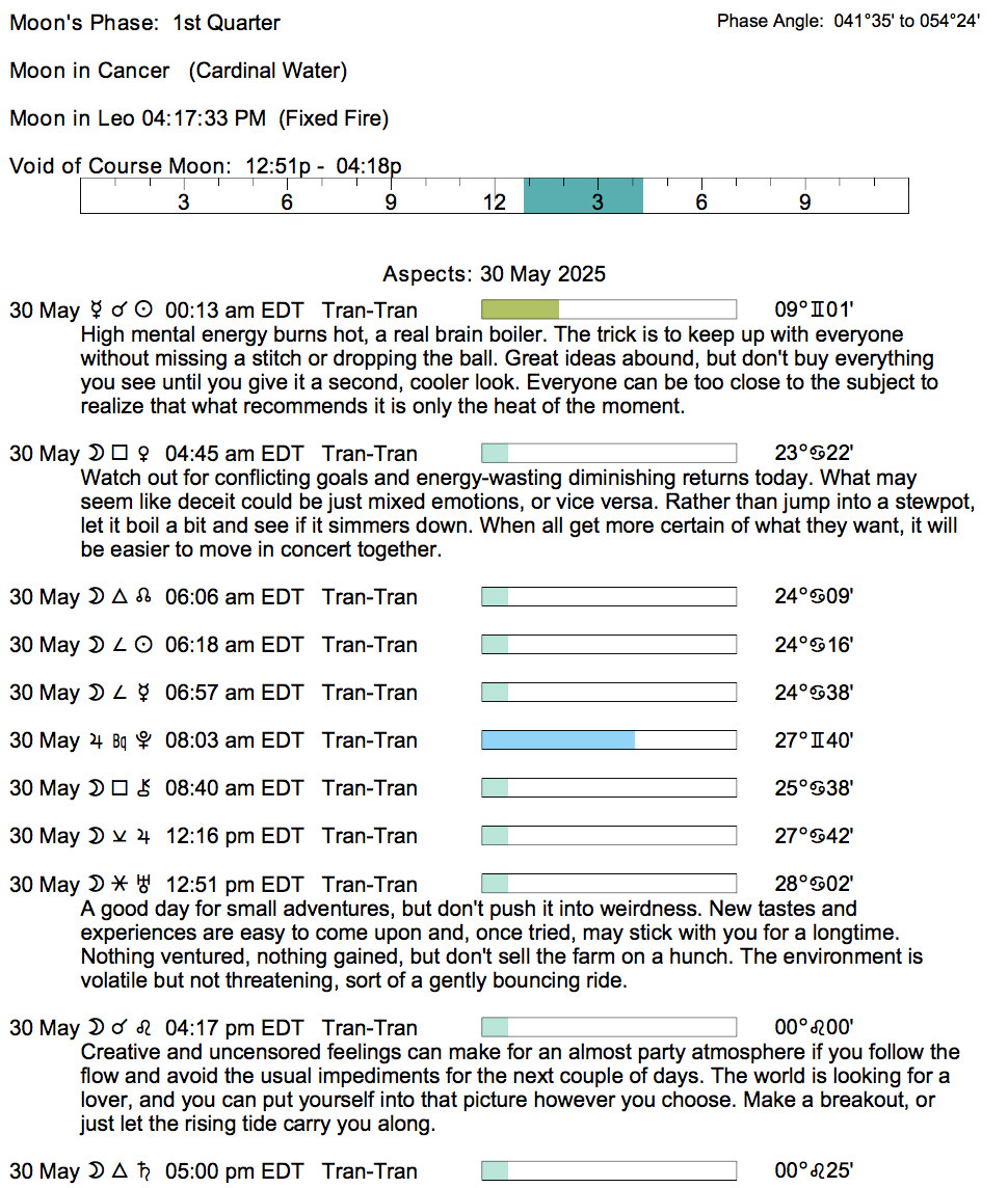 Planet Color Key: The longer the bar, the slower the aspecting planet, and the longer the duration of the planet’s transit.