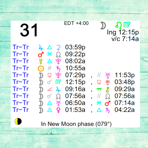 An auspicious time for any project demanding endurance or tolerance. Also good for establishing new habits and rituals.